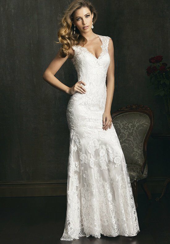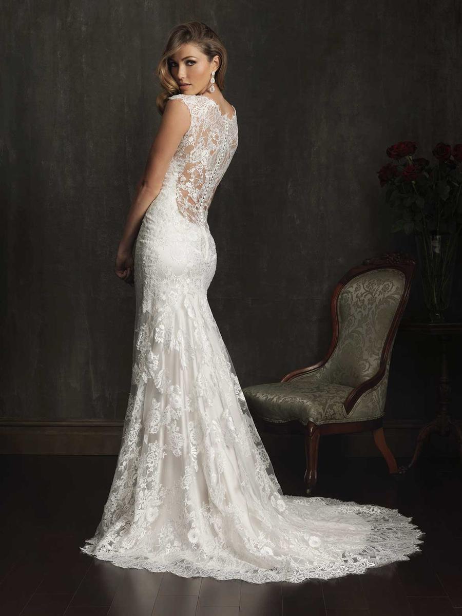 9068 by Allure Bridal is the dress of the week at Precious Memories. Its made of beautiful lace and English Net. A sexy and sophisticated style in all over lace, This slim gown features a V-shaped neckline with delicate cap sleeves. This true beauty of this style is the dramatic back, while the entire back is covered in sheer lace for coverage, the low back is beautifully shaped for the finish touch. This week only. Offers ends March 22, 2024.
