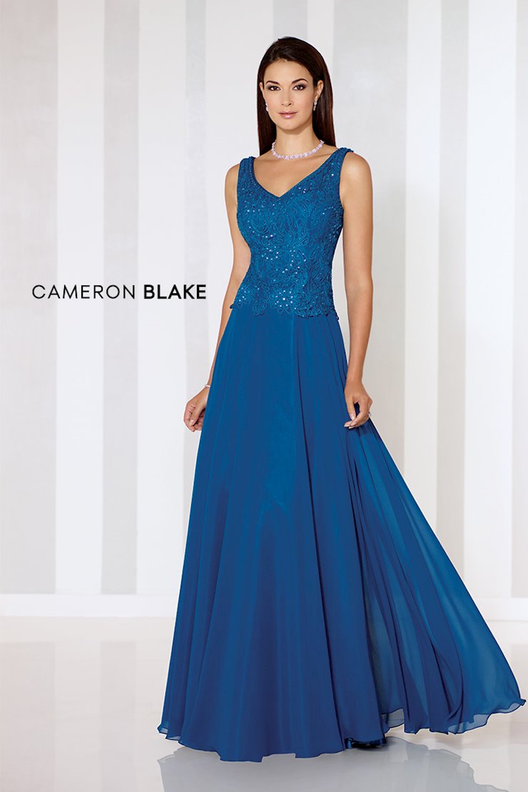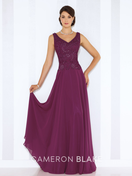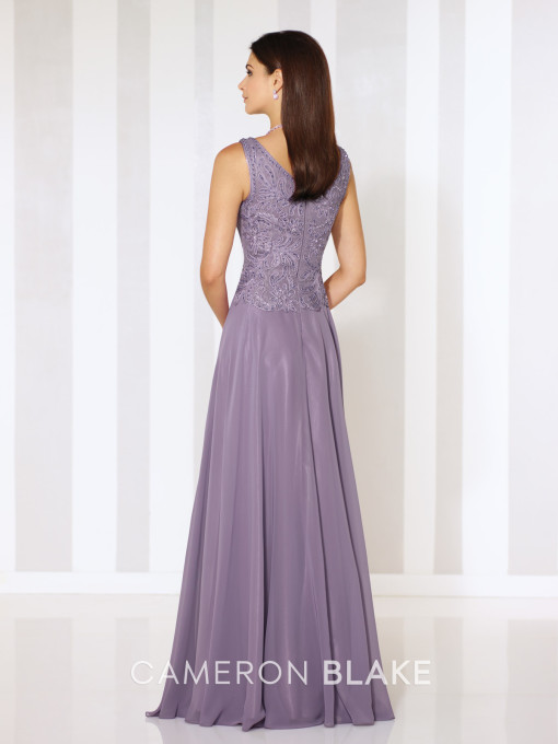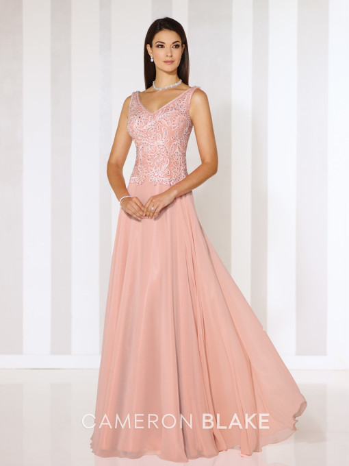 Sleeveless chiffon A-line gown with front and back V-necklines, ribbon work bodice with slight dropped waist, flyaway skirt. Matching shawl included.