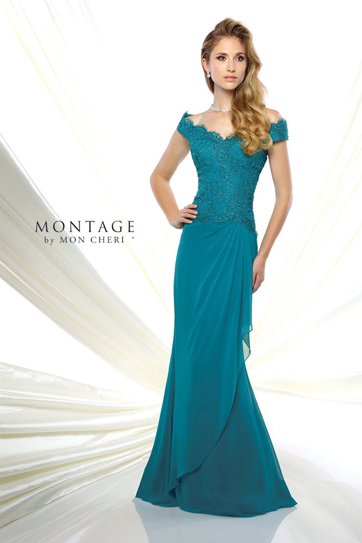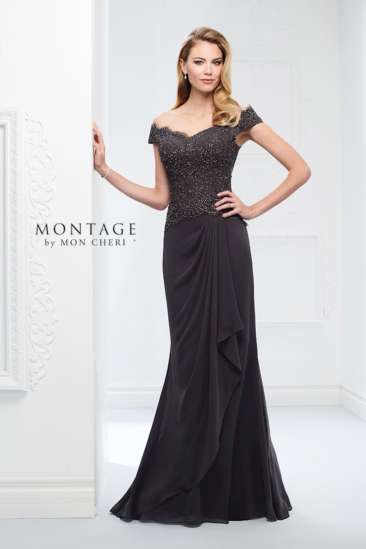 Off-the-shoulder chiffon and lace fit and flare gown, hand-beaded lace bodice with dropped waist, side draped chiffon skirt, sweep train. Matching shawl included.