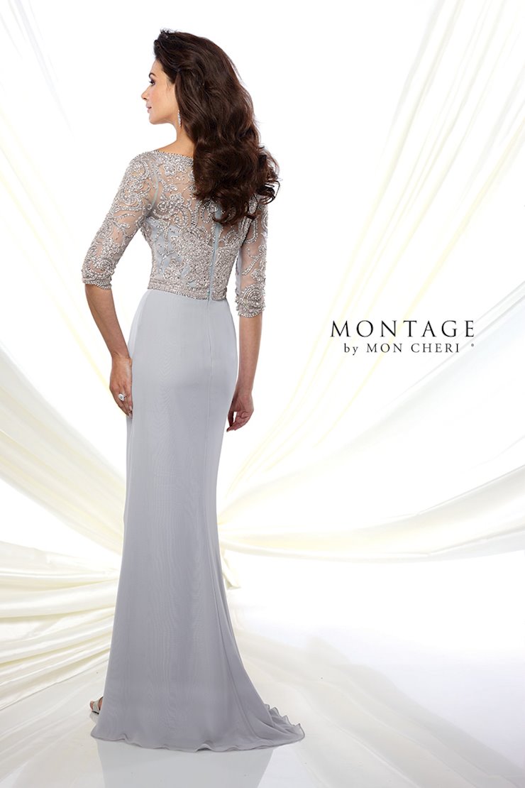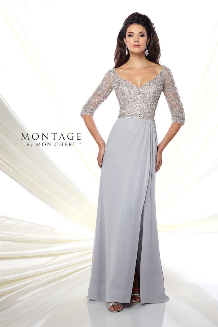 Chiffon sheath with hand-beaded illusion three-quarter length sleeves, tip-of-the-shoulder V-neckline, beaded bodice with beaded illusion back, side draped skirt with side slit and sweep train.