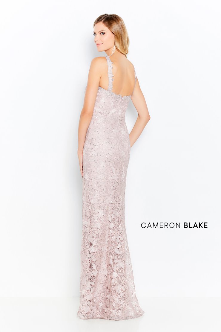 Sleeveless allover lace sheath decorated with sequin and stone accents, square neckline and back, natural waistline with a slim skirt. Matching allover lace jacket included.