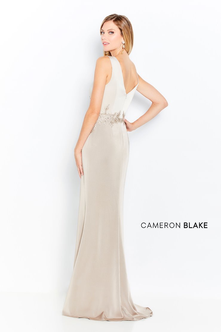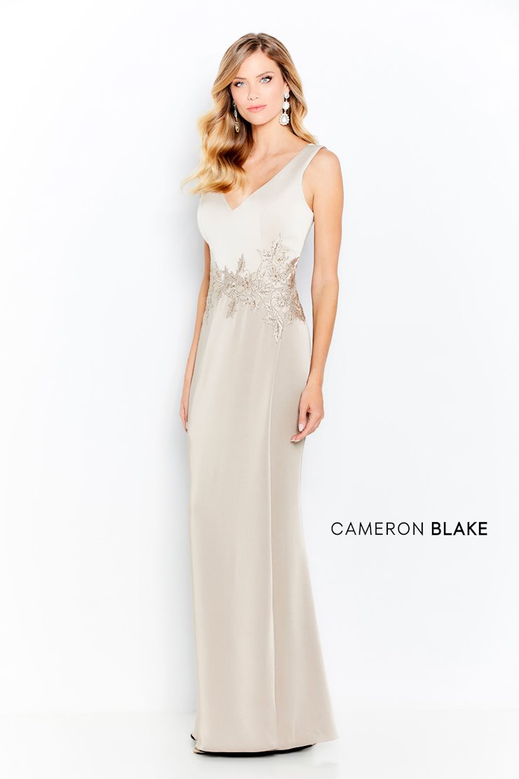 Sleeveless two-tone stretch satin sheath, V-neckline and back, natural waistline decorated with lace appliques and stone accents, overlapping skirt at side front with a sweep train. Matching stretch satin shawl included.