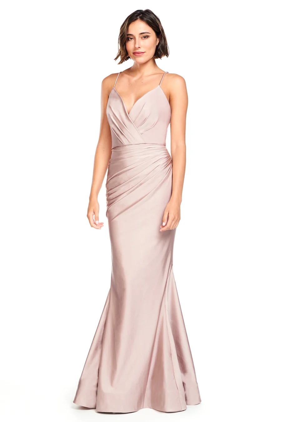 Spaghetti strap overlapping V-neck ruched bodice with diagonal pleated skirt and horsehair hem. This style includes self knee length lining.