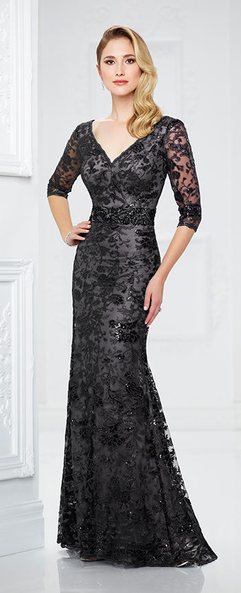 Elegant tulle with metallic embroidery and sequins over a slim fit and flare silhouette with embroidered illusion 3/4 sleeves.