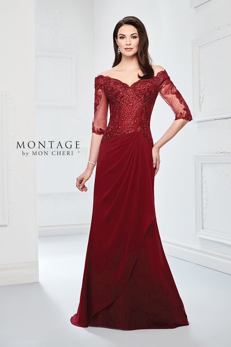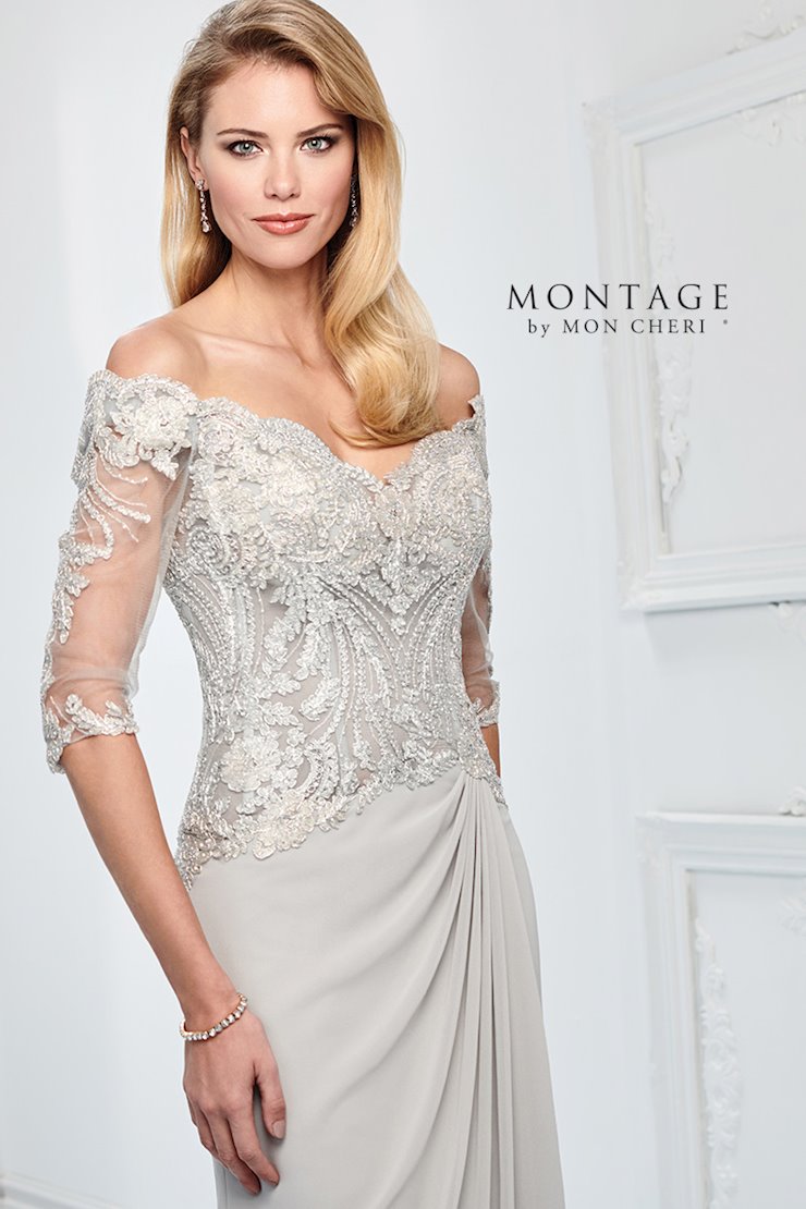 Exquisitely feminine, this off-the-shoulder corded metallic lace and chiffon slim A-line gown offers illusion and lace three-quarter length sleeves, a heavily layered illusion and lace bodice with hot stones and a sheer midriff, and an asymmetrically side draped chiffon skirt with a sweep train. For more coverage, separate bodice lining is included.