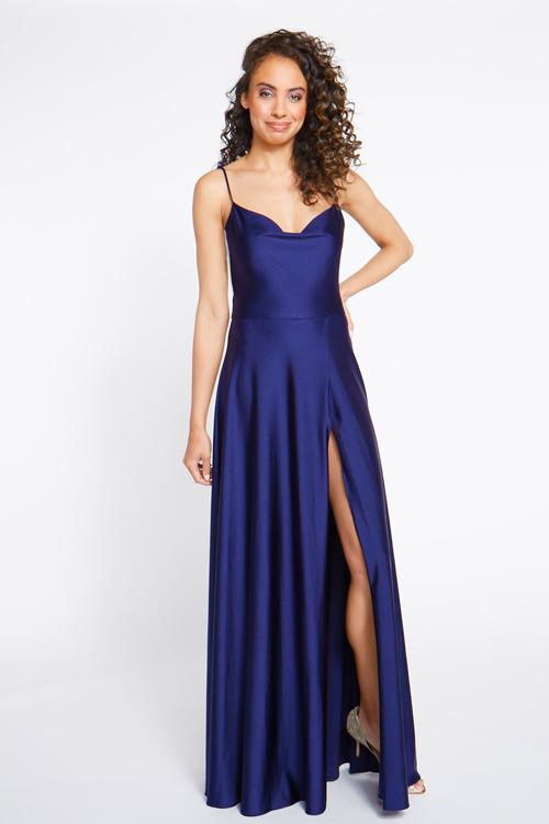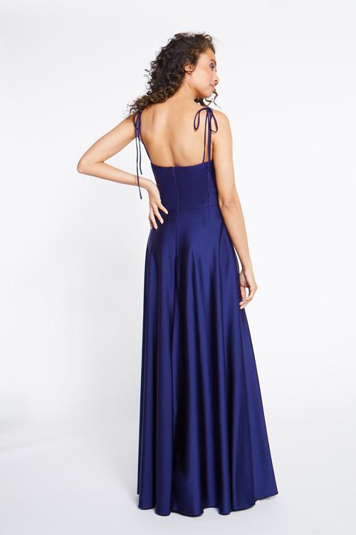 Adjustable tie straps to a cowl bodice and wrap ball skirt.