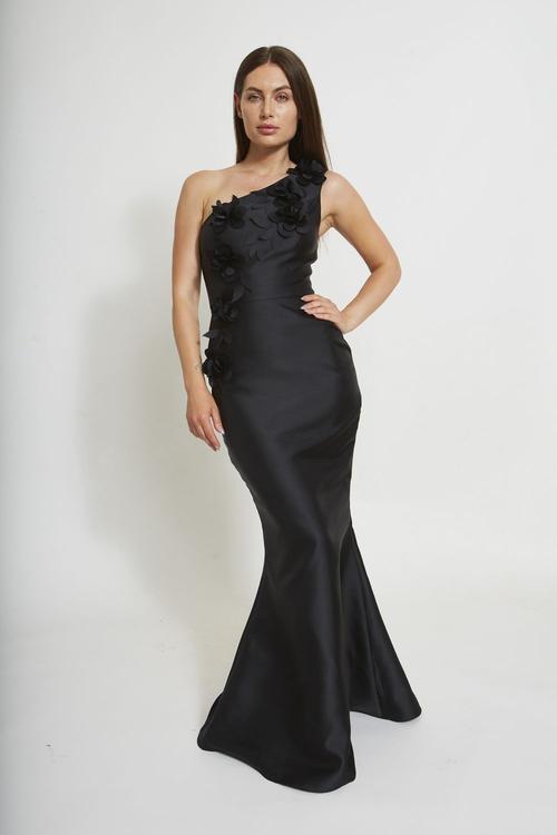 One shoulder bodice with mermaid skirt with 3-D flowers cascading down the bodice and right hip.