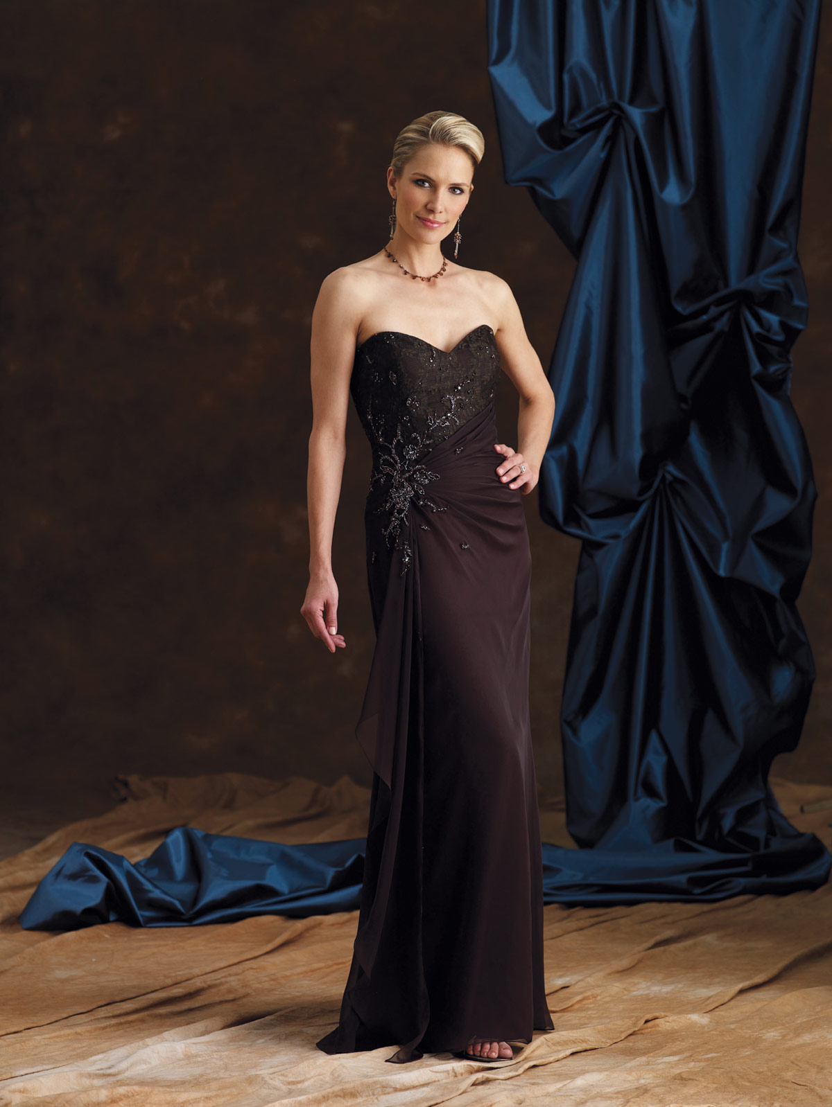 Two-piece iridescent chiffon dress set, strapless A-line dress with sweetheart neckline. Dress shown in Dark Cocoa on model, size 12 is available in Dark Cocoa color only.