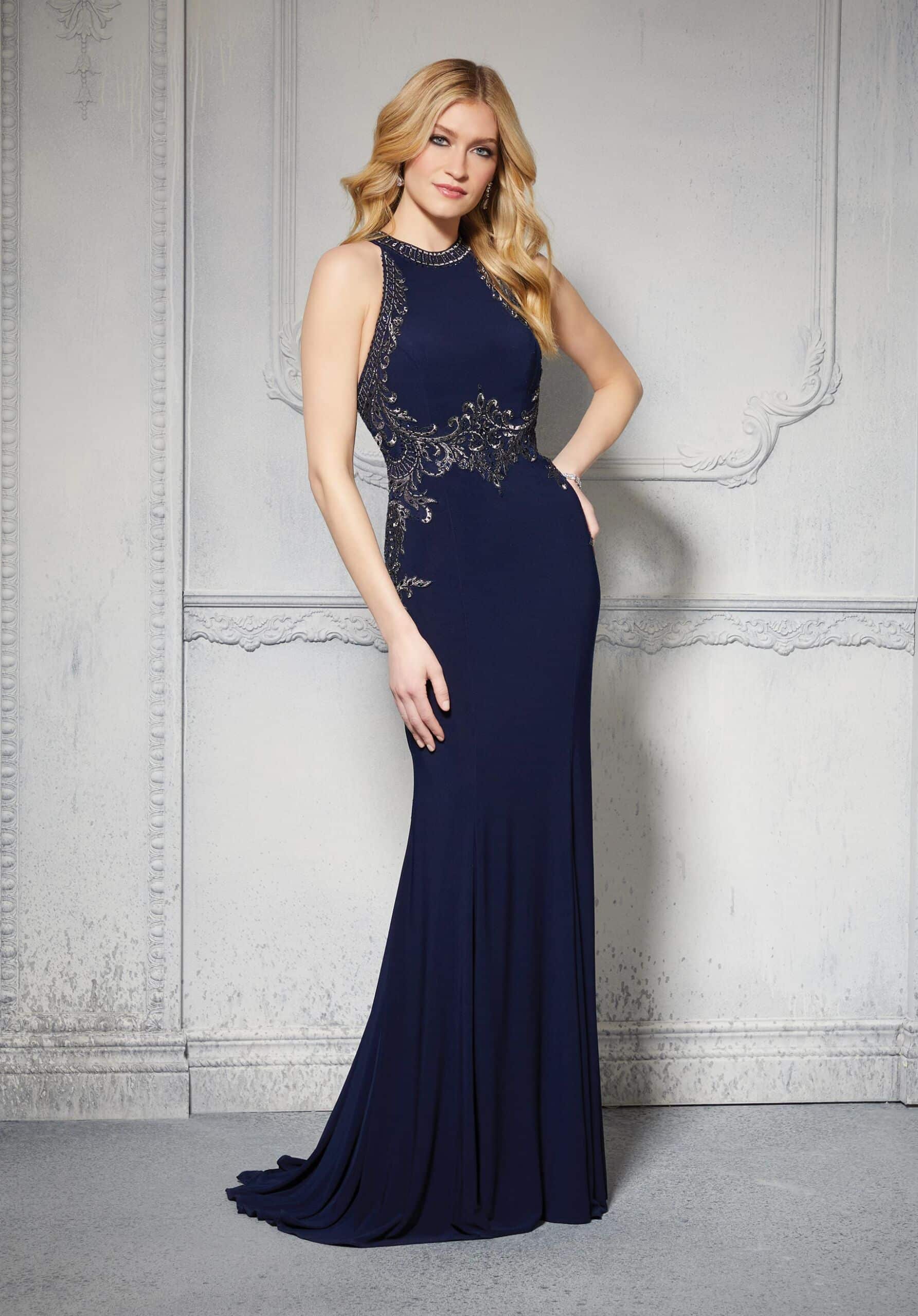 71625 by MGNY Morilee – Step into sophisticated style with this stunning form-fitting evening gown. Crafted from smooth, figure-flattering jersey, this elegant sheath silhouette is designed to accentuate your natural curves with effortless grace. The sleeveless bodice features a chic high halter neckline, beautifully adorned with embroidery and crystal or that radiates confidence and poise.