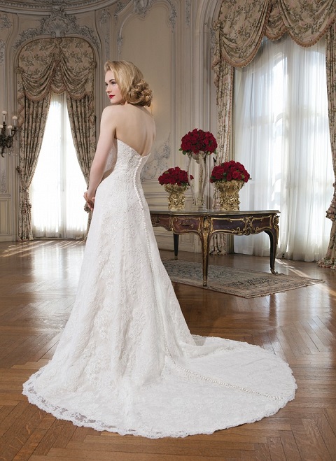 Be a picture perfect bride in this strapless sweetheart all over alencon lace A-line wedding dress. The chapel length train is perfect for any setting. Covered buttons conceal the back zipper.