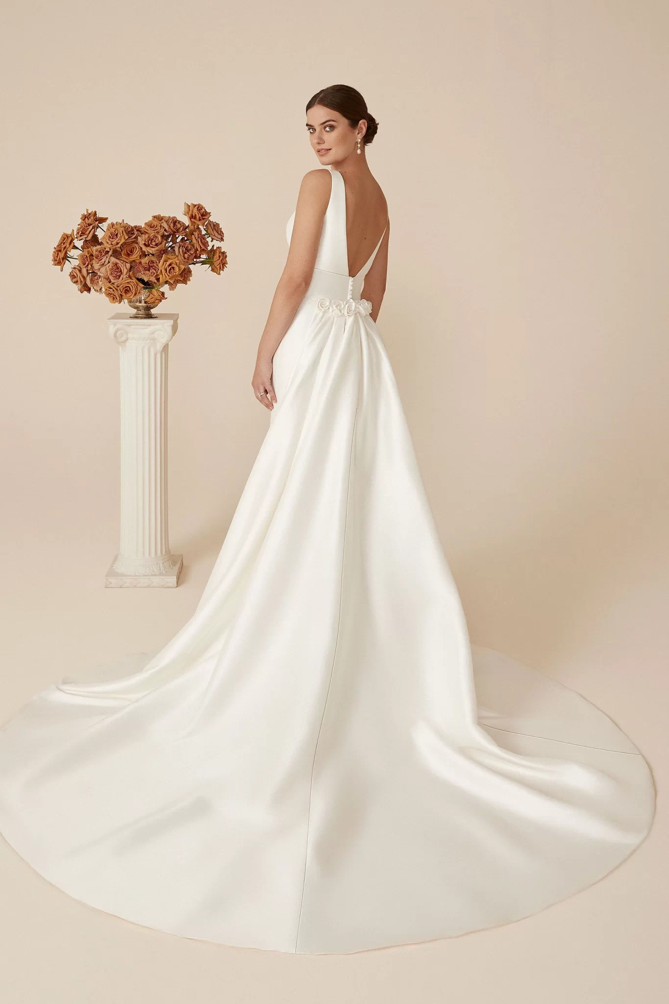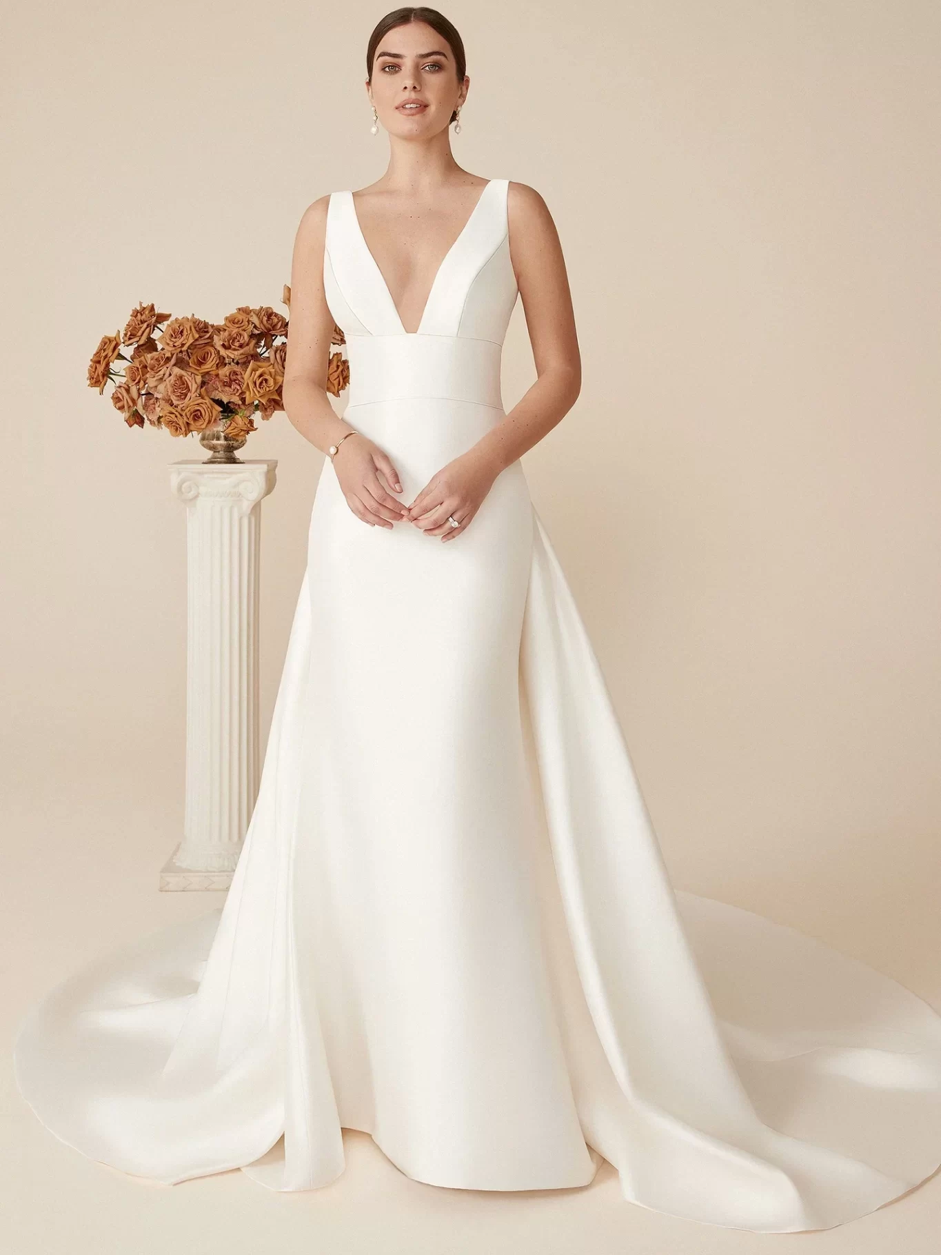 Show off your shape in this sleek fit and flare Mikado gown. It will have you feeling confident and sexy with the plunging neckline in the front and back with matching buttons from the neckline to the hem. Paired with a full detachable chapel length train that completes the look.