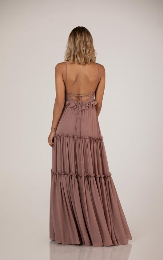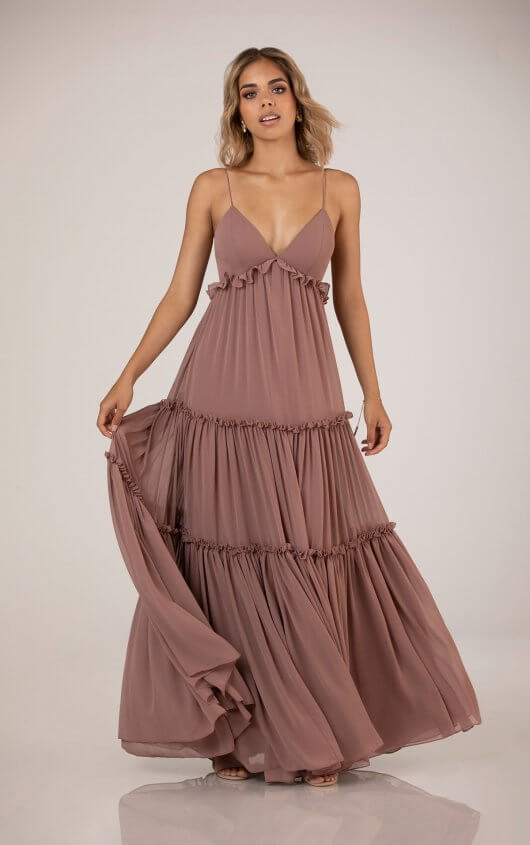 For the boho bride, this chiffon bridesmaid dress will effortlessly fit your wedding day vision. Delicate spaghetti straps connect at the back of the dress in an overlapping zig-zag pattern, coming together in a sweet bow. The long, tiered skirt adds extra dimension and volume to the silhouette, creating an effortlessly boho look. This bridesmaid dress is available in more than 30 colors, including desert-inspired Harvest Gold and rusticly romantic Peony.