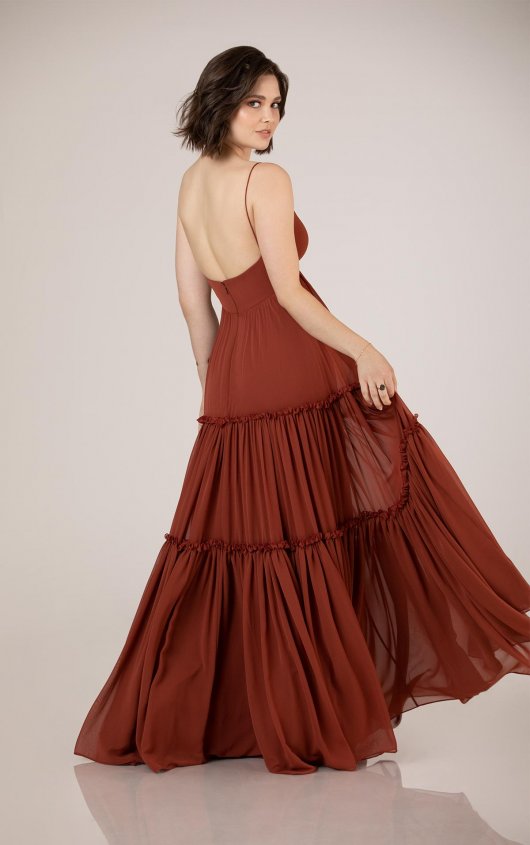 Your bridesmaids can dance the night away in this breezy, comfortable dress. This full-length chiffon sleeveless gown is effortlessly boho and can easily be dressed up or down to meet your bridal vision. Delicate spaghetti straps with a sweet V-neckline create a beachy, casual look to match any outdoor, rustic venue. This bridesmaid dress is available in more than 30 colors, including boho-inspired shades Burnt Orange, Harvest Gold, Teal, Peony and Toffee.