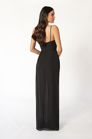 A chic Poly Chiffon sheath gown with asymmetrical neckline and adjustable spaghetti straps. The sheath skirt has a front slit for added movement.