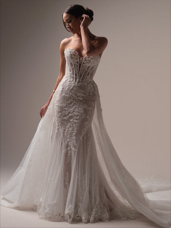 Benjie Royale by Maggie Sottero is the perfect example of sexy meets sophisticated in this shimmering beaded mermaid wedding dress — the perfect choice for a fairytale wedding vibe with modern flair.