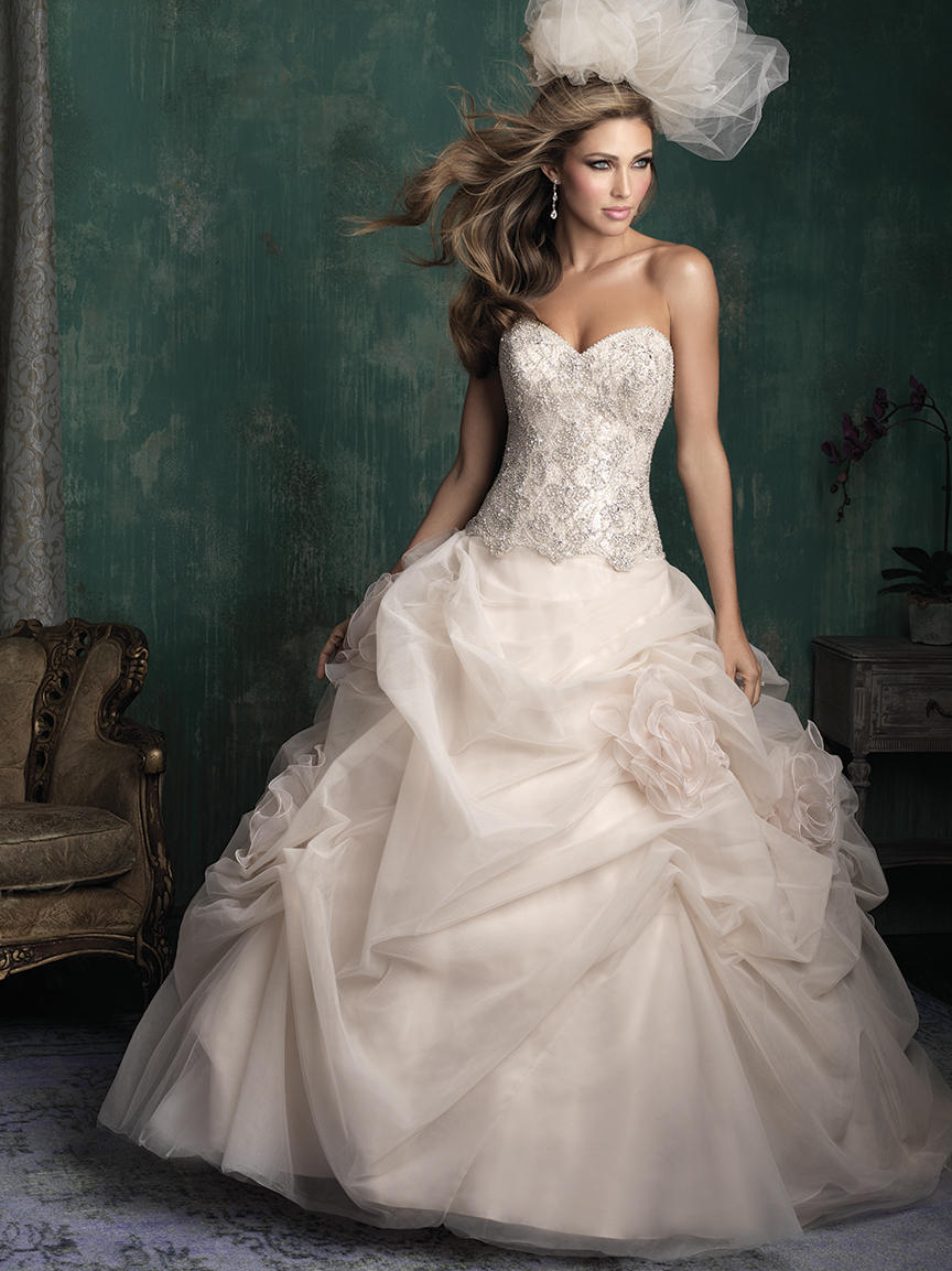 If you want to stand out on your wedding day look no further. This ballgown features a beaded bodice and a organza pickup skirt.