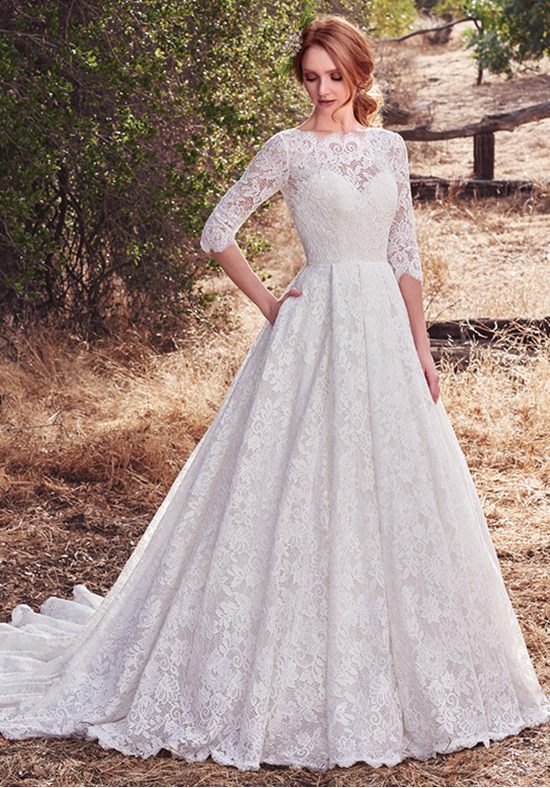 Cordelia is a vintage-inspired wedding dress that features allover lace with sheer lace comprising the three-quarter sleeves, bateau neckline, and square back. Softly scalloped trim completes the unique glamour of this ballgown. Complete with pockets at the hip and finished with covered buttons over zipper closure.
