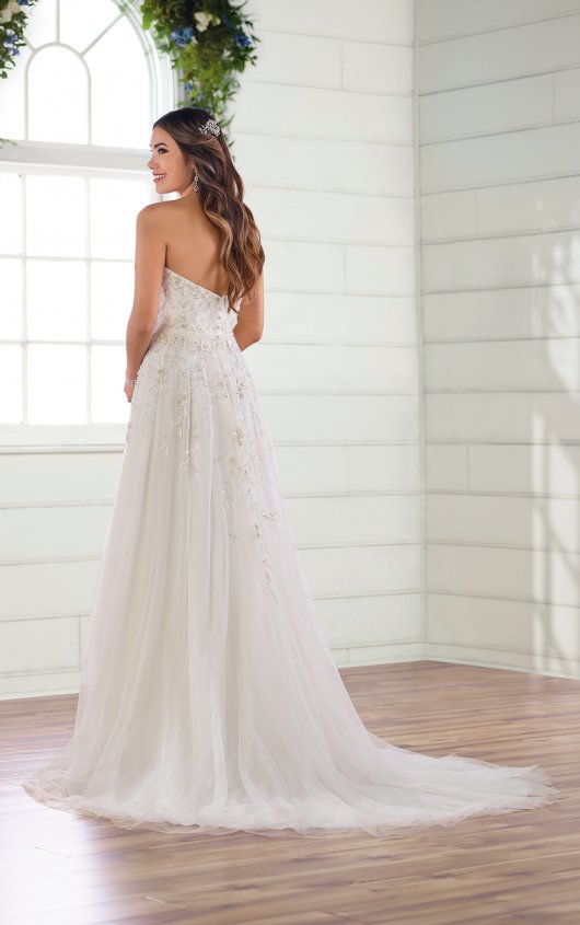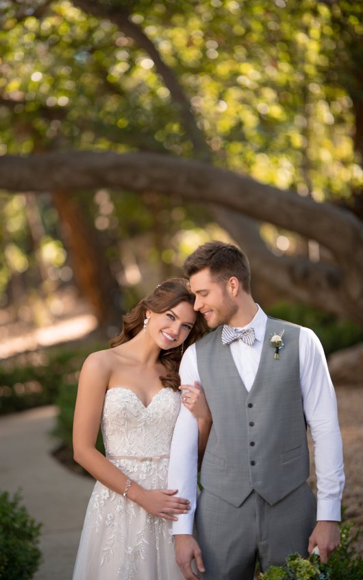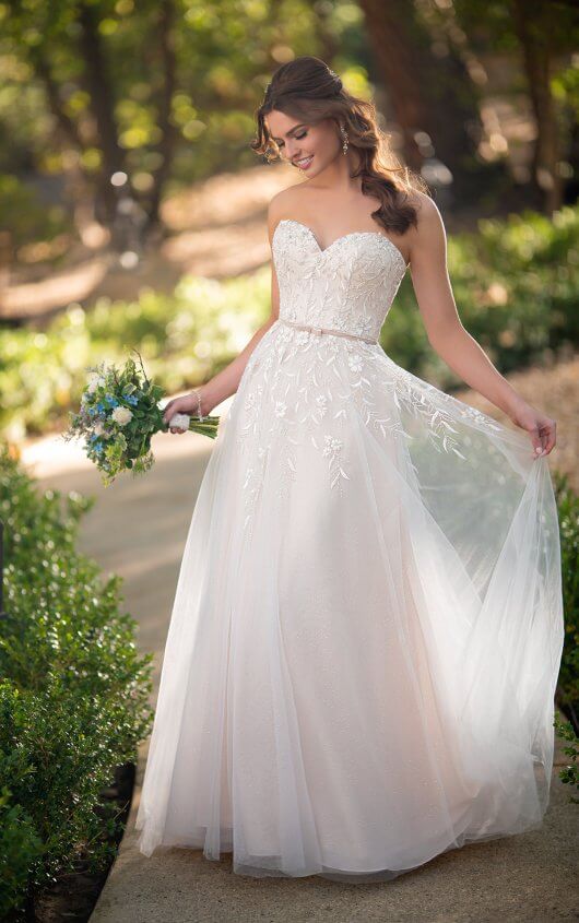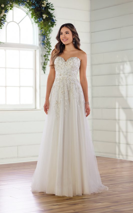 Classy, cute and classic, the playful bride will fall in love with this adorable style. The attached velvet belt makes this wedding dress unique with a vintage touch, while the sweetheart neckline is delicate and feminine. A bright sparkle glistens throughout the soft A-line silhouette, intermingling with a mixture of embroidery, lace and stunning 3D elements along the bodice. Organic, leaf-inspired patterns echo throughout the beading while pearl work adds to the old-world charm. A high back adds supportive construction, complementing the soft tulle skirt and gentle train—featuring an added layer of glitter tulle for an extra dose of sparkle. This wedding gown is also available in plus sizes.