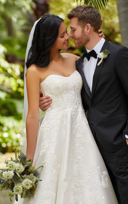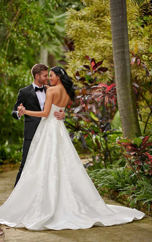 Classic details meet modern magic with this perfectly of-the-moment ballgown from Essense of Australia. A soft, sweetheart neckline graces the top of the bodice for a smooth and open decolletage–highlighting your face and collarbone effortlessly. Gorgeous Matte Mikado fabric creates the perfect base for this grand silhouette, featuring a strong pleated skirt, pockets and subtle hints of floral lace appliques for a touch of dimension. Fabric-covered buttons start from the top of the high-construction back and flow to the base of the elegant train for the finishing touch. This gown is also available in plus sizes.