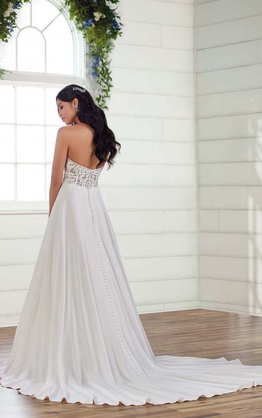 A mixed-fabric masterpiece, this modern and extraordinarily unique wedding gown from Essense of Australia is the balanced style statement you desire! An exposed bodice with sweetheart neckline and unique cotton-style organic laces features visible, wrapped boning for a daringly sheer effect. Meanwhile, a lengthy train flows from beneath the subtle volume of the pleated skirt for a hint of unexpected drama to complement your cool and casual yet fashion-forward bridal style.