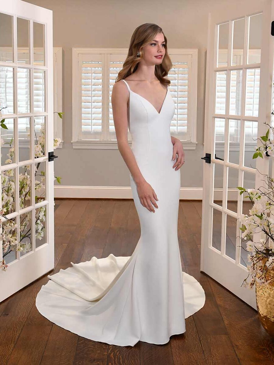 D3305 is a simple v-neckline fit-and-flare wedding dress with sheer back detail.