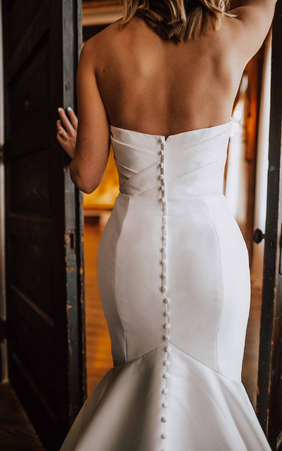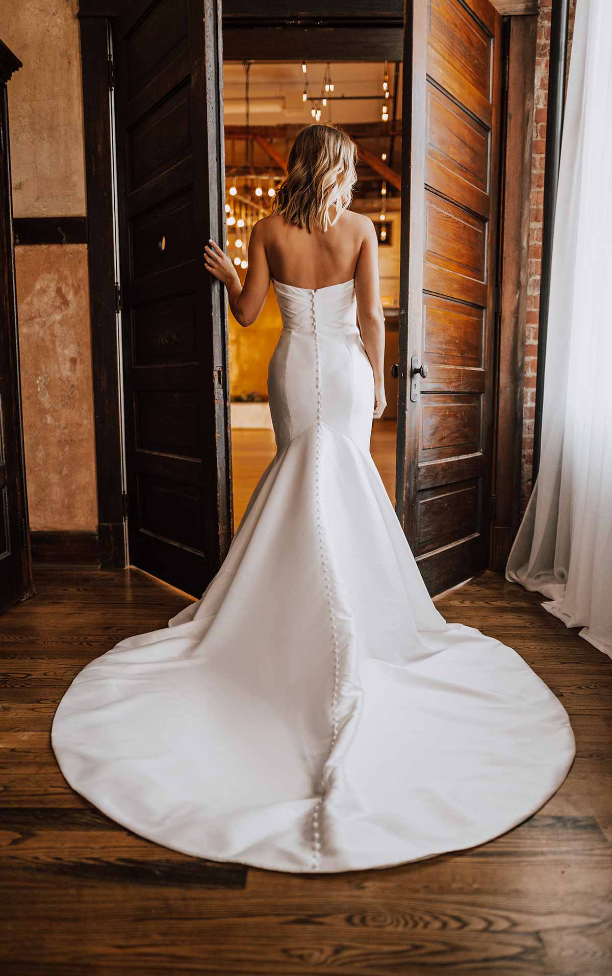 Simplicity meets glamour in Style D3340. With a high-fashion twist on a classic mermaid silhouette, this wedding dress pulls inspiration from both Old Hollywood and the 2000s dress styles for a design made for the modern bride. On the bodice, the fabric overlaps for a glamorous ruched effect. The pointed neckline adds a modern, ultra-chic twist to the classic sweetheart neckline. This gown effortlessly hugs the body’s natural curves with a comfort lining layer for all-day wearability and comfort. The skirt flares out to a voluminous skirt with a full train, complete with fabric-covered buttons trailing to the hem of the skirt. This gown is also available in plus sizes.