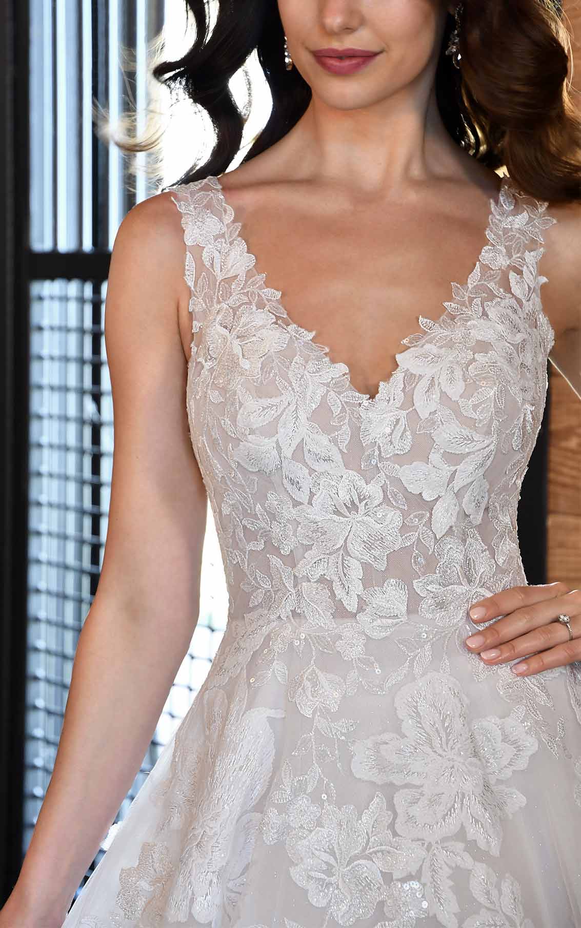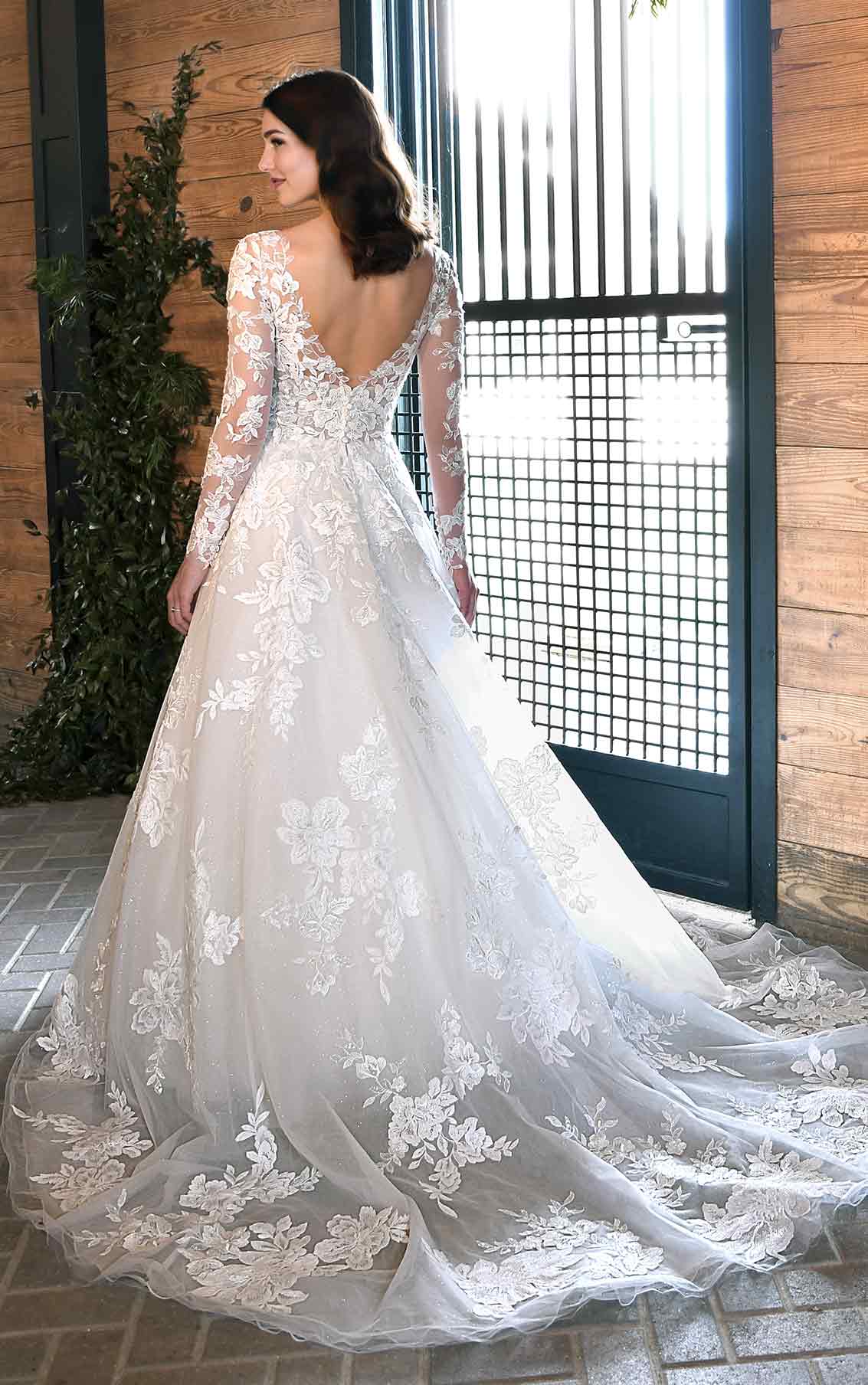 “Refined feminine elegance comes alive in Style D3358. This wedding dress exudes classic romance, with large-scale floral motifs decorating the bodice of the gown and cascading down the skirt and across the arms. The optional long sleeves pair illusion tulle with the sparkling lace and sequin details for a formal, timeless look. For a lighter look, the dress is also available without the sleeves. Organic lace spaces line the modest V-neckline, with sheer illusion tulle along the bodice and in the back showing off the intricate details of the lovely lace motifs. At the skirt, layers of tulle create incredible volume for a truly spectacular walk down the aisle.”-Essense of Australia