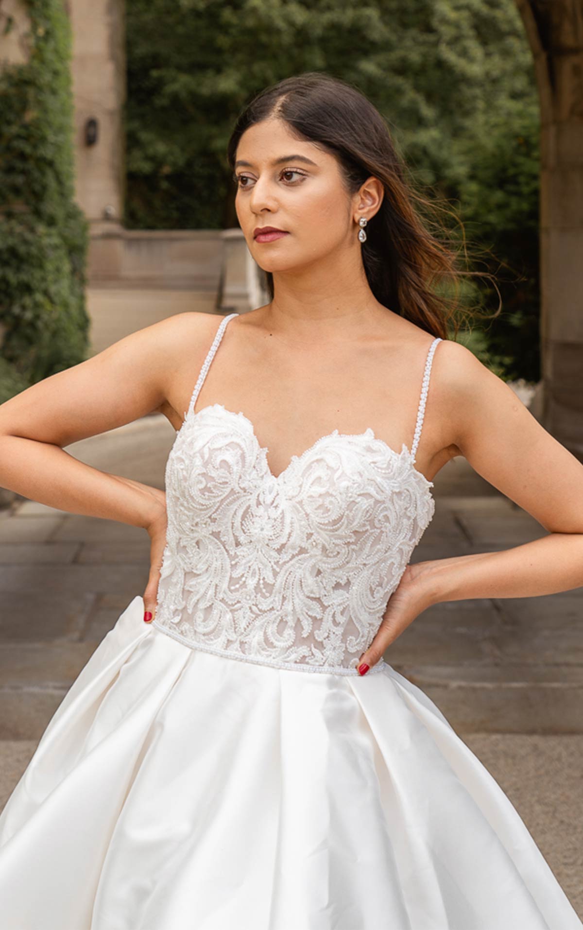 Style D3461 by Essense of Australia is a Mikado skirt ballgown with a beaded bodice and beaded straps. This beautiful fabric resembles royalty and class bringing the “Classic bride” with a modern twist ensuring the perfect fairytale moment. Waist defining, this timeless silhouette is a perfect combination of femininity and romance. Beauty and elegance follow a big skirt that for sure reminds us of fairytales and enchantment. The number one style for a waist synching look you are sure to feel amazing in.