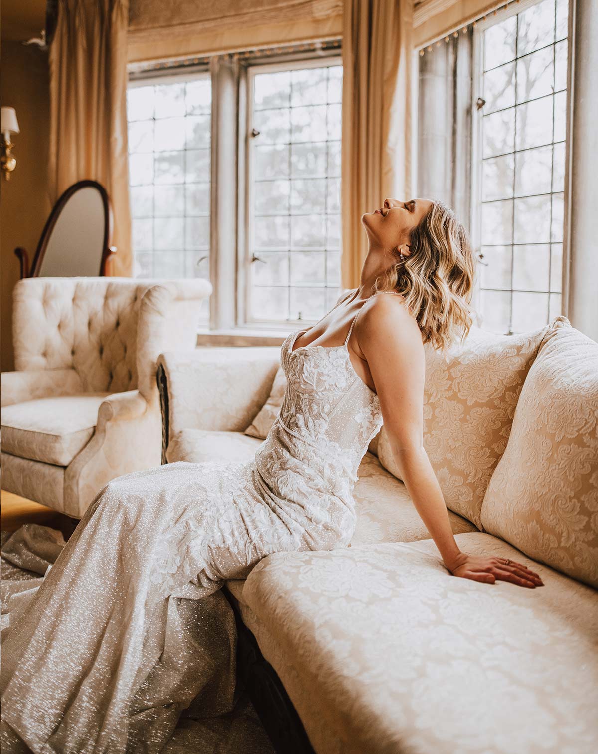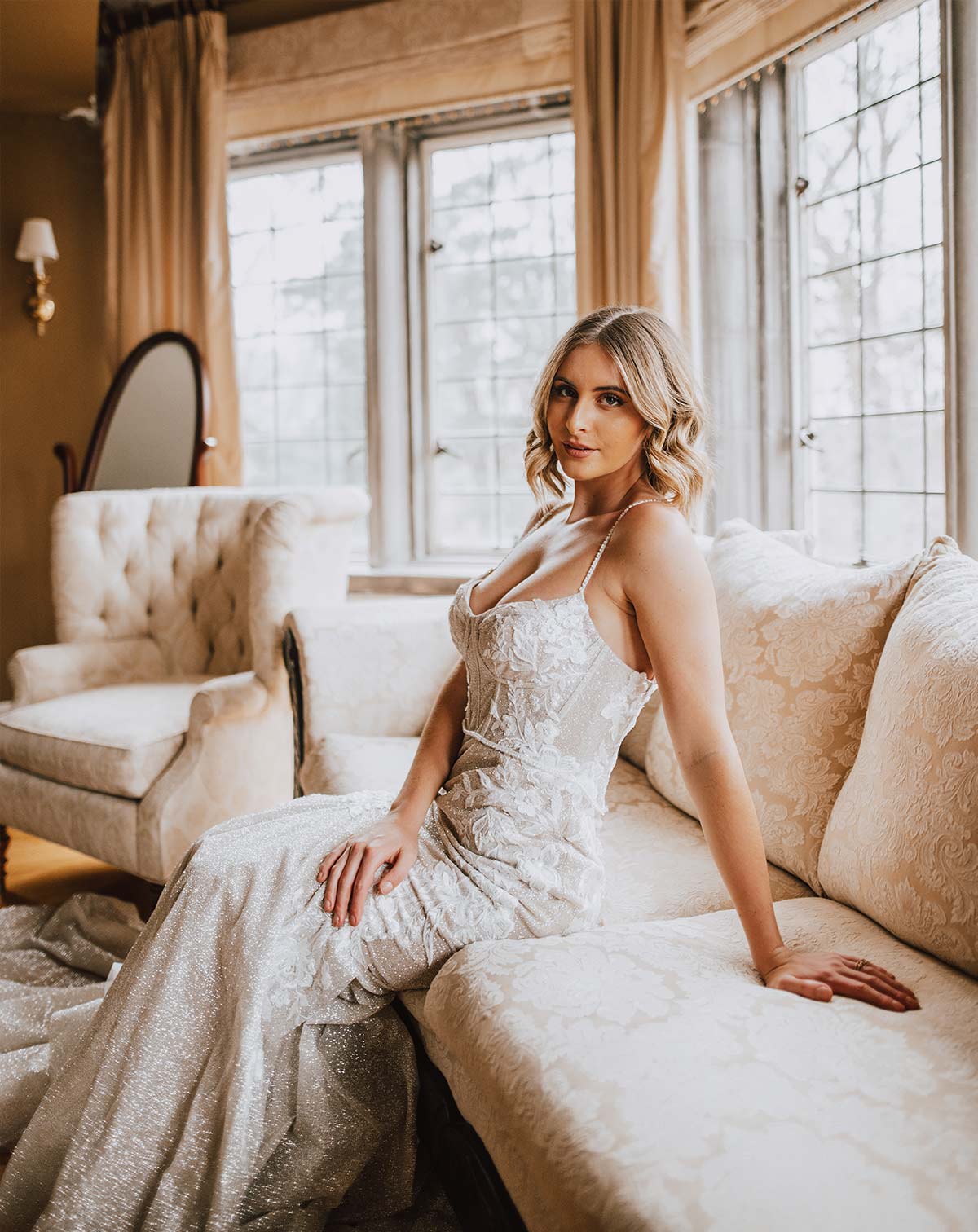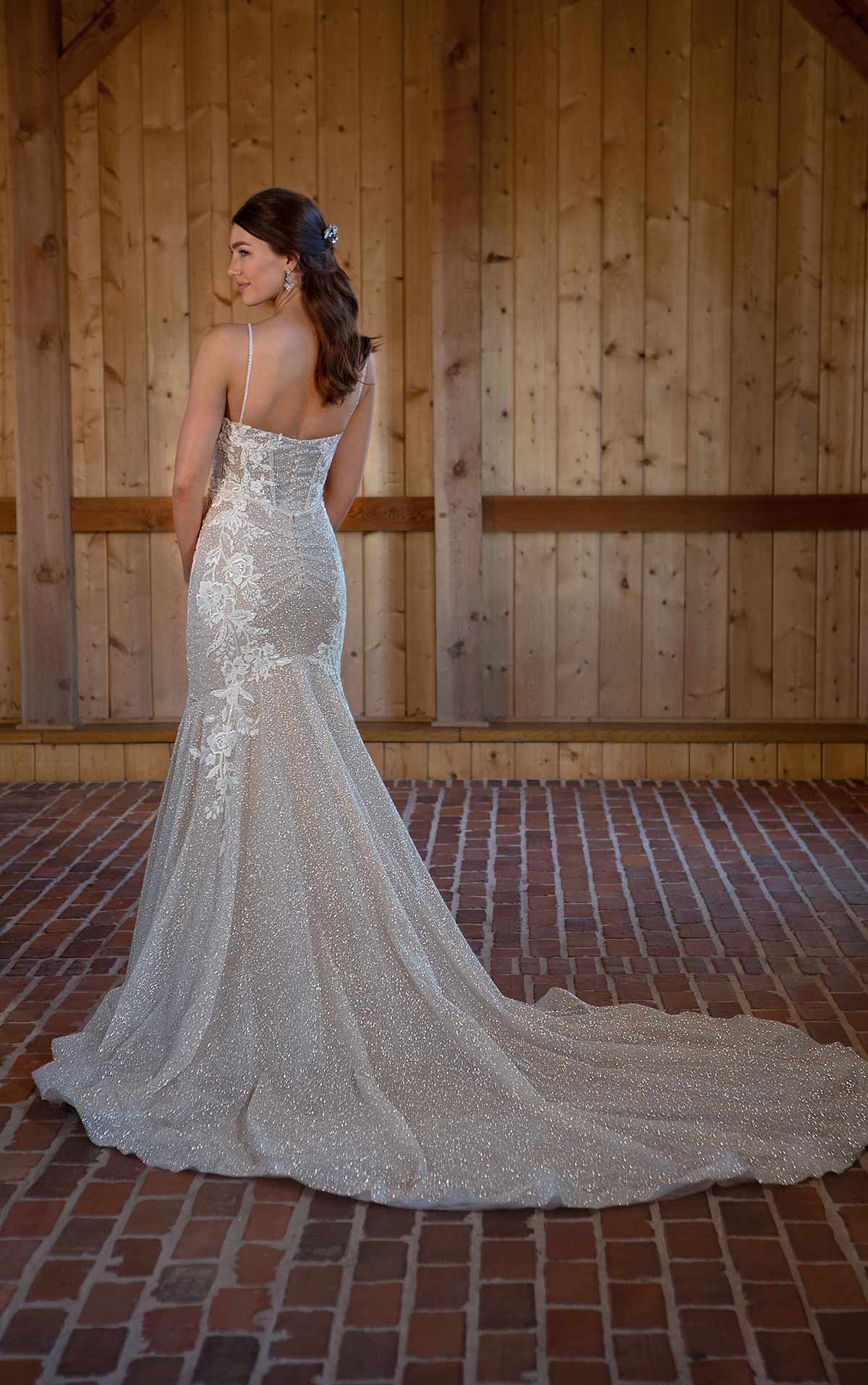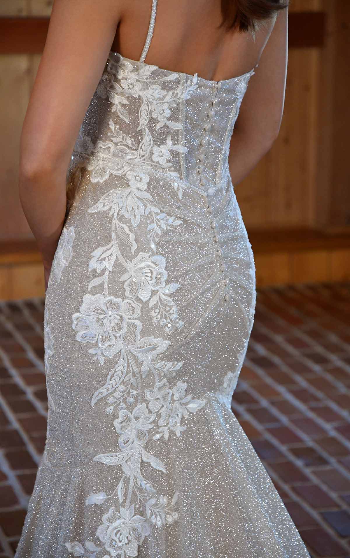 “Style D3486 exudes a luxurious drama that radiates from every angle of this stunning wedding dress. Sexy spaghetti straps grace the shoulders and open the neckline to a flattering contoured bodice with modern corset-style boning. The allover silver sparkle is accented with ivory lace appliques—all set upon a color backdrop of a gorgeous champagne silver color. In the back, fabric-covered buttons gather at the center of the subtle ruching detail for an ultra-flattering fit-and-flare design. With a final dramatic gesture, the horsehair hem holds the structure of the glamorous flared skirt before resolving into an epic, dramatic train.”-EOA