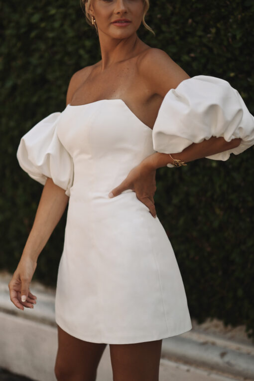 CHIC STRAPLESS SHORT MINI WEDDING DRESS WITH DETACHABLE SLEEVES AND OVERSKIRT