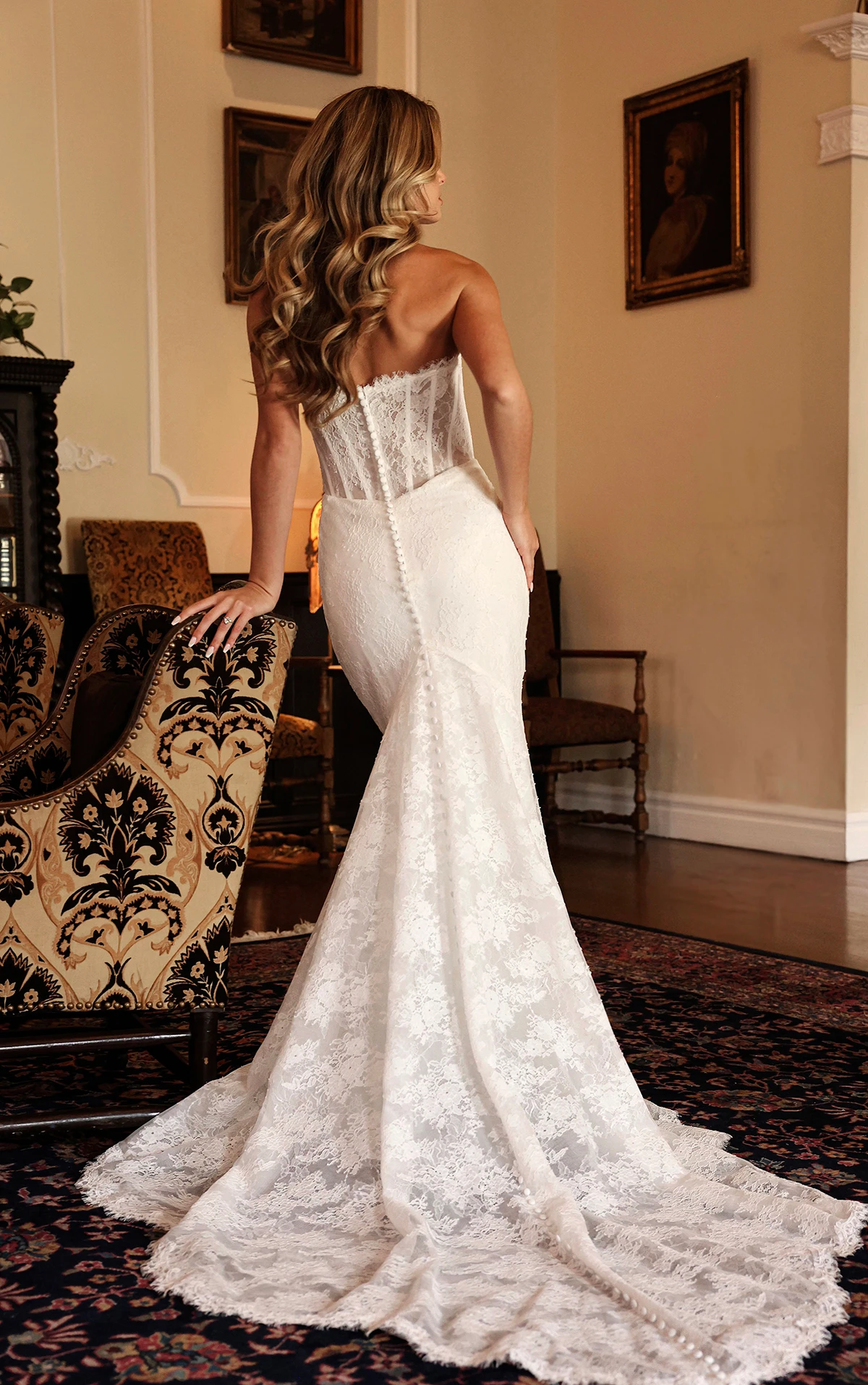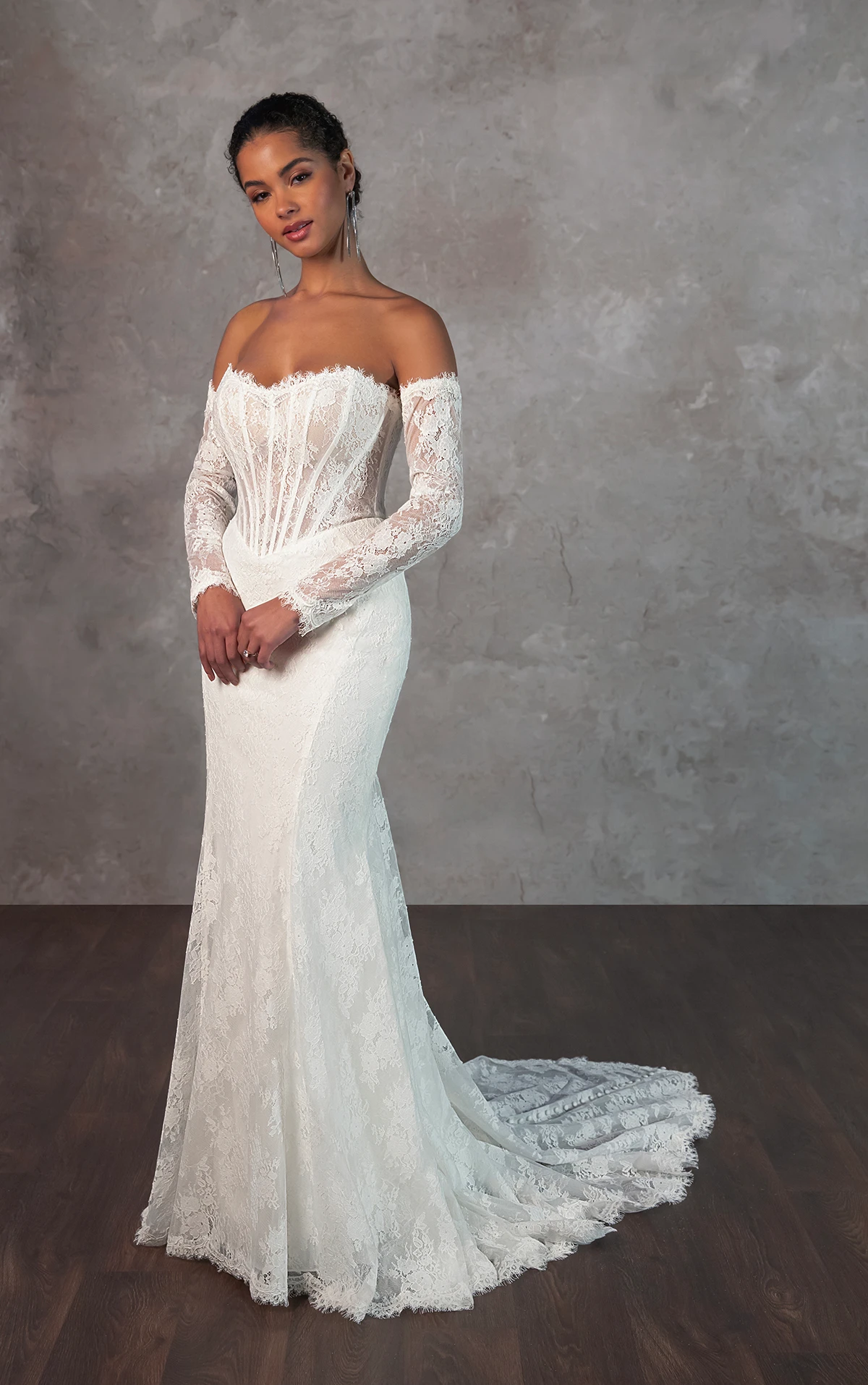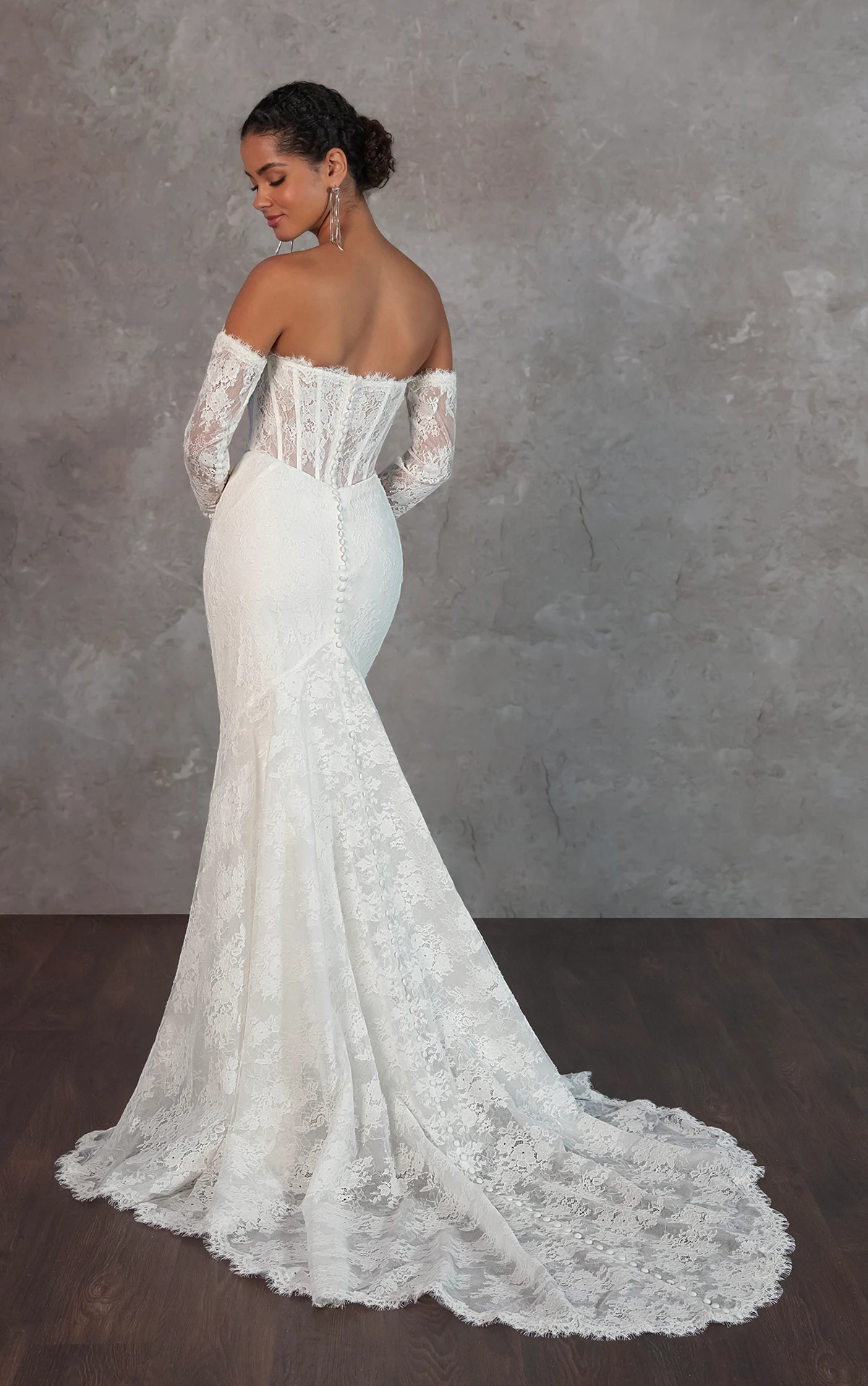 Style D4287 seamlessly fuses timeless elegance with contemporary charm, creating a bridal look that is both captivating and refined. The strapless sweetheart bodice, adorned with delicate eyelash lace trim, showcases exquisite couture craftsmanship with its exposed boning and sheer details. For added versatility, detachable sheer lace sleeves offer a touch of romance and drama. The allover Chantilly lace column silhouette drapes effortlessly, tracing every curve for a stunning effect. Designed for the modern bride with a love for classic beauty, this gown ensures an unforgettable walk down the aisle. This gown is also available in plus sizes.