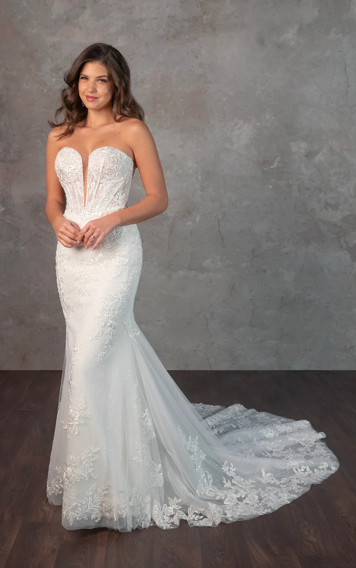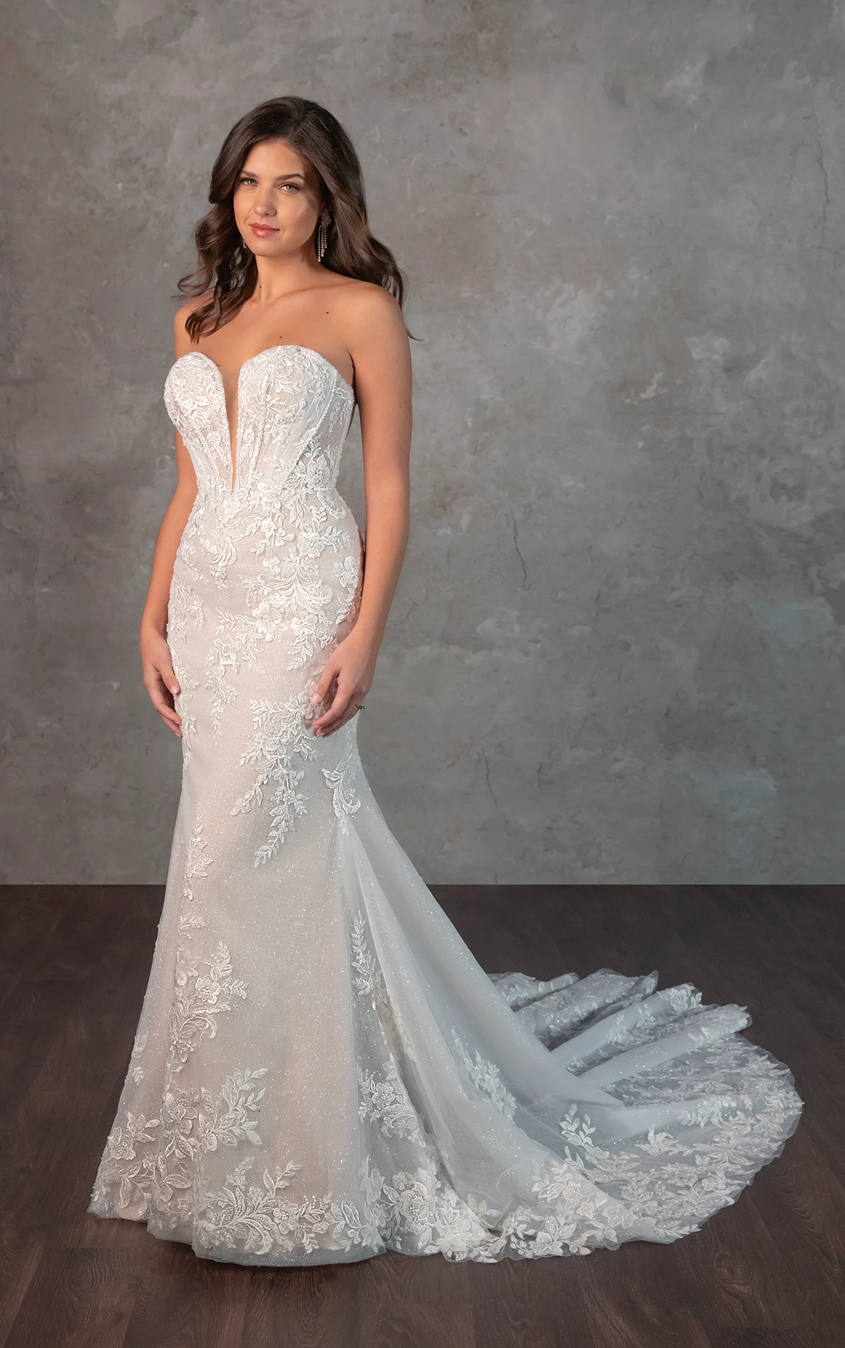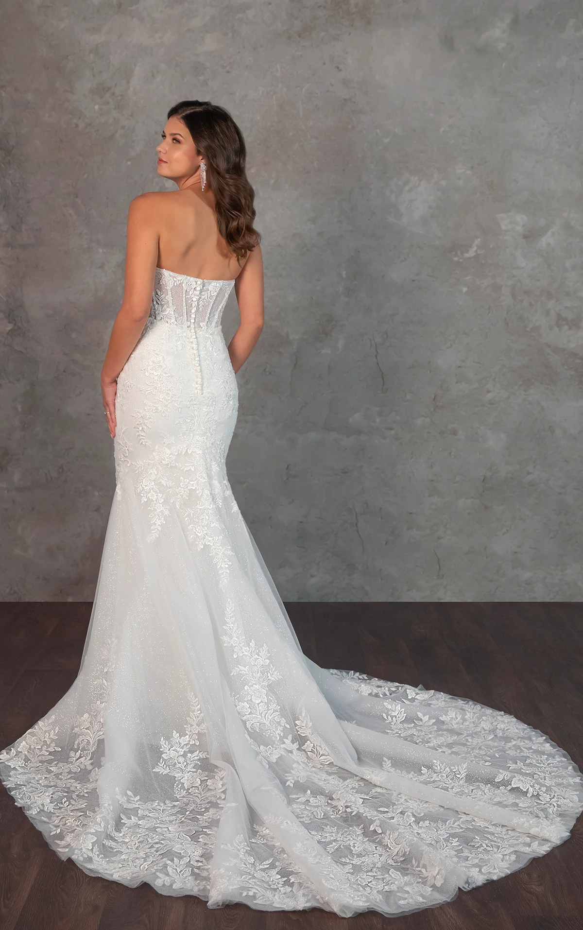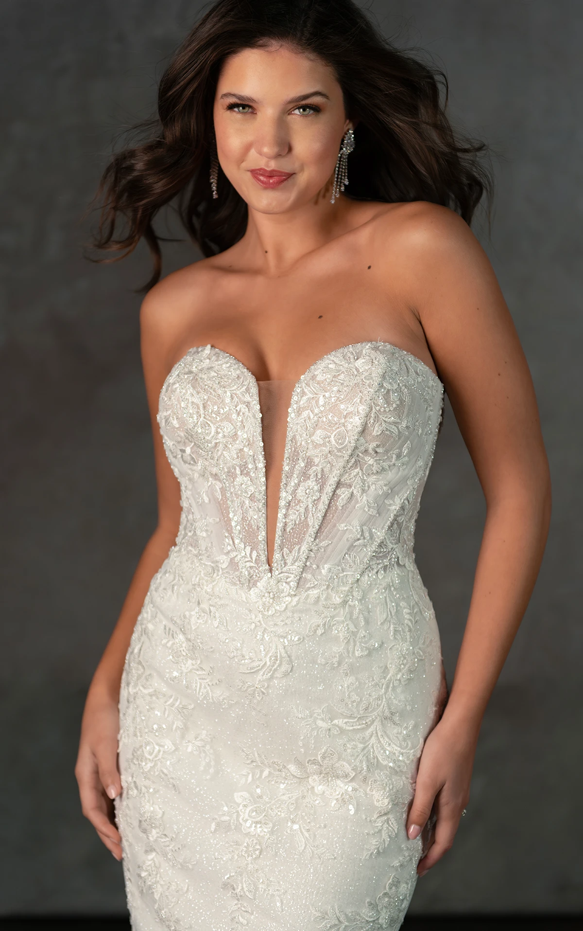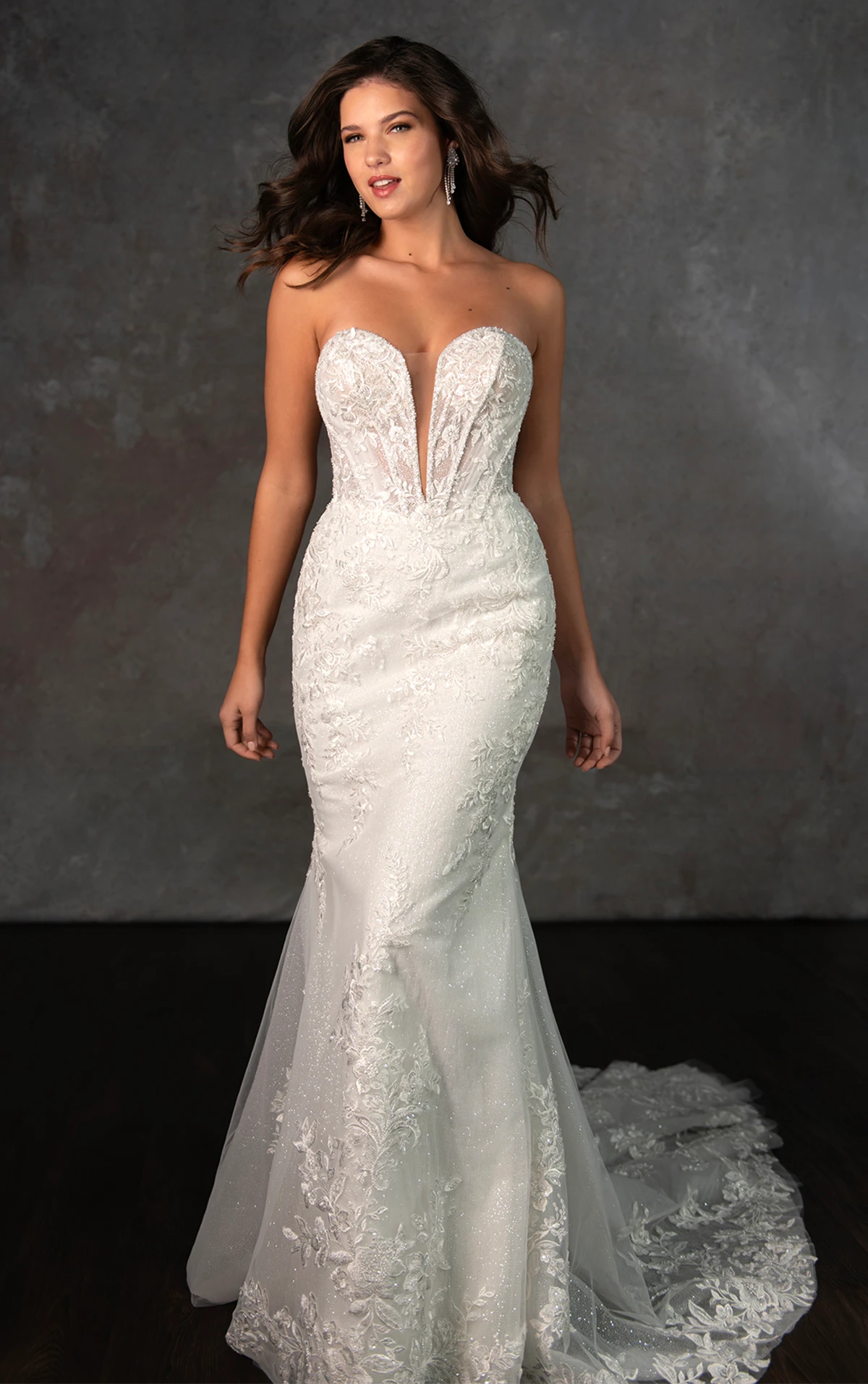 A breathtaking lace masterpiece, Style D4341 exudes the beauty and luxury of a designer wedding gown. The strapless plunging sweetheart neckline accentuates the intricately structured bodice, where architectural corsetry blends old world romance with contemporary fashion. Exposed beaded boning and detailed lace appliques create a mesmerizing effect, cascading over the fit-and-flare skirt before flowing into a shimmering, dream-like train adorned with lace accents. The result is a striking and sophisticated bridal look designed to captivate from every angle. This gown is also available in plus sizes in the bodice-lined option.