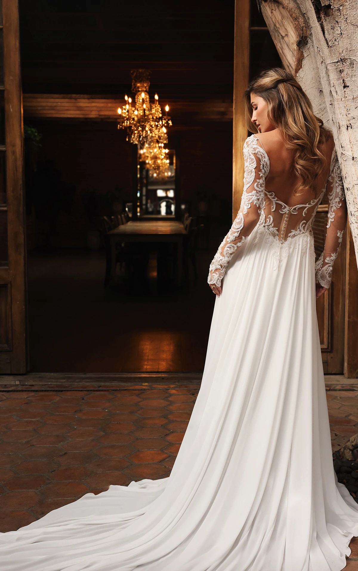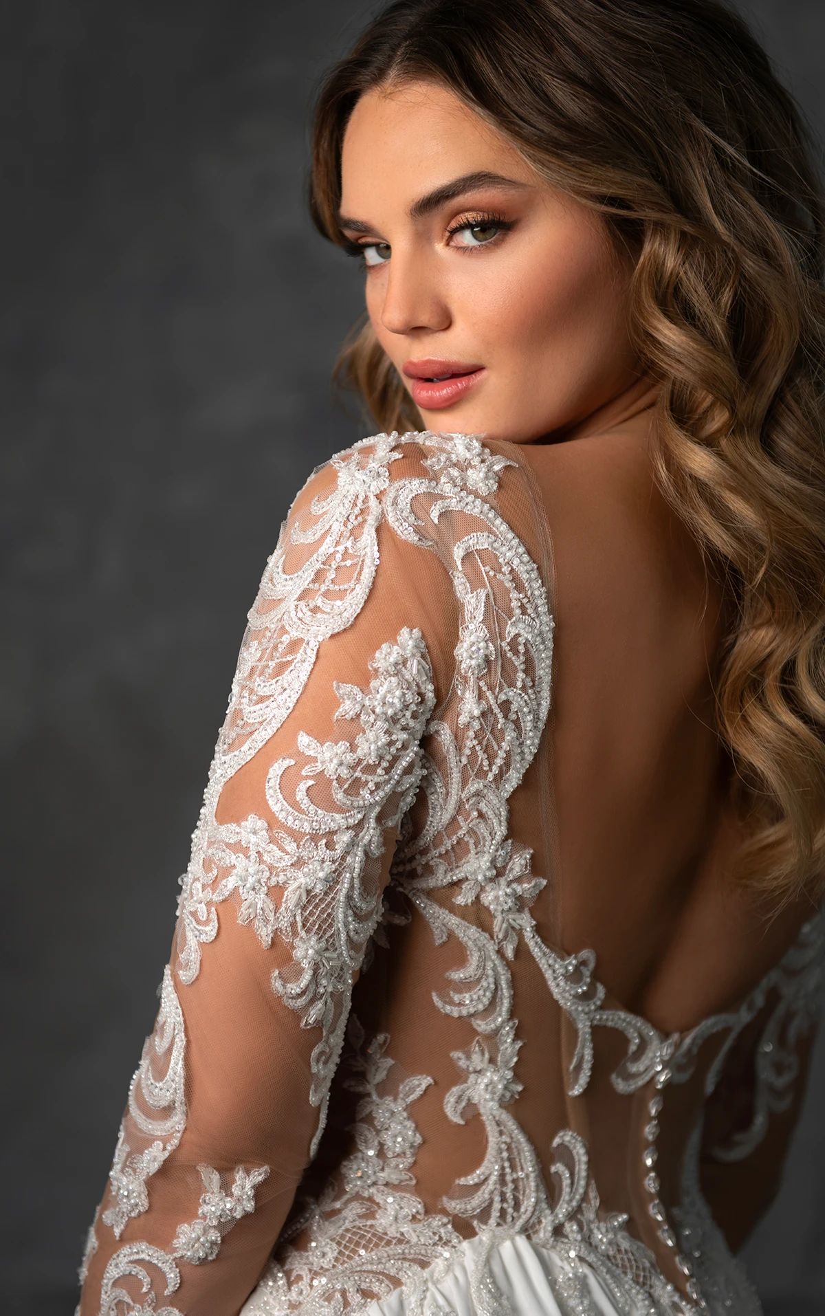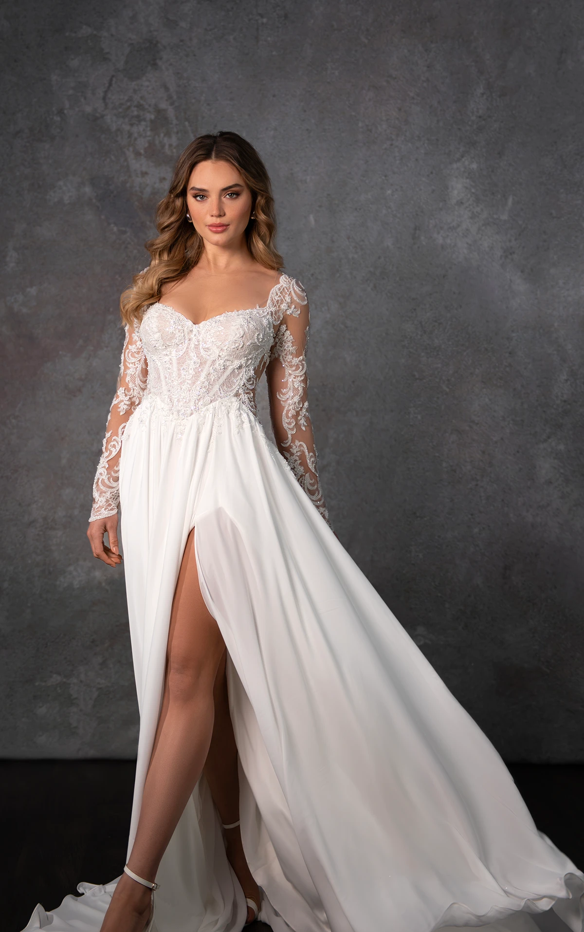 Romantic and timeless. Style D4350 blends lace and chiffon in a gown designed for the modern bride. The soft sweetheart neckline is framed by sheer floral lace sleeves, adding a graceful touch. Sparkling beading and scrolling lace detail highlight the bodice, while side cutouts bring a hint of allure . The dramatic sheer scoop back is finished with crystal buttons, creating an elegant and unforgettable look.