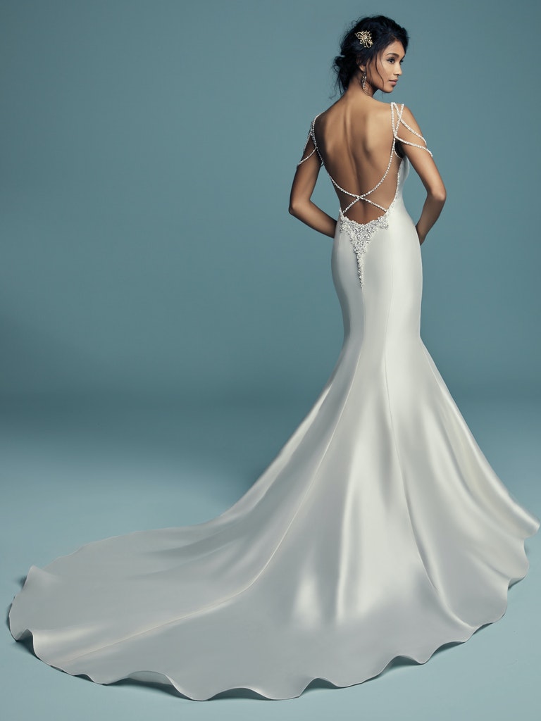 This modern wedding dress has a sleek mermaid silhouette and finished off with delicate beaded straps.