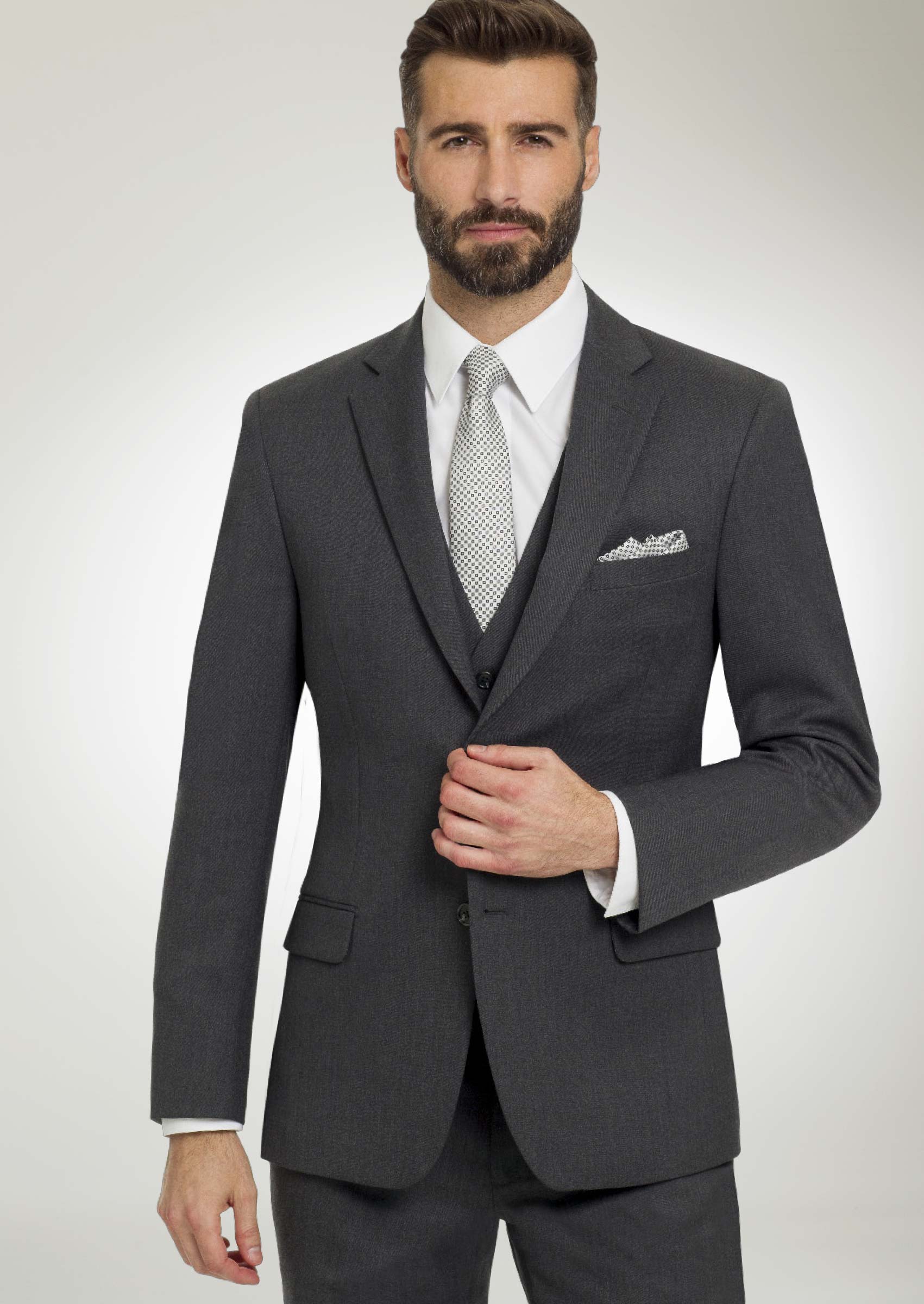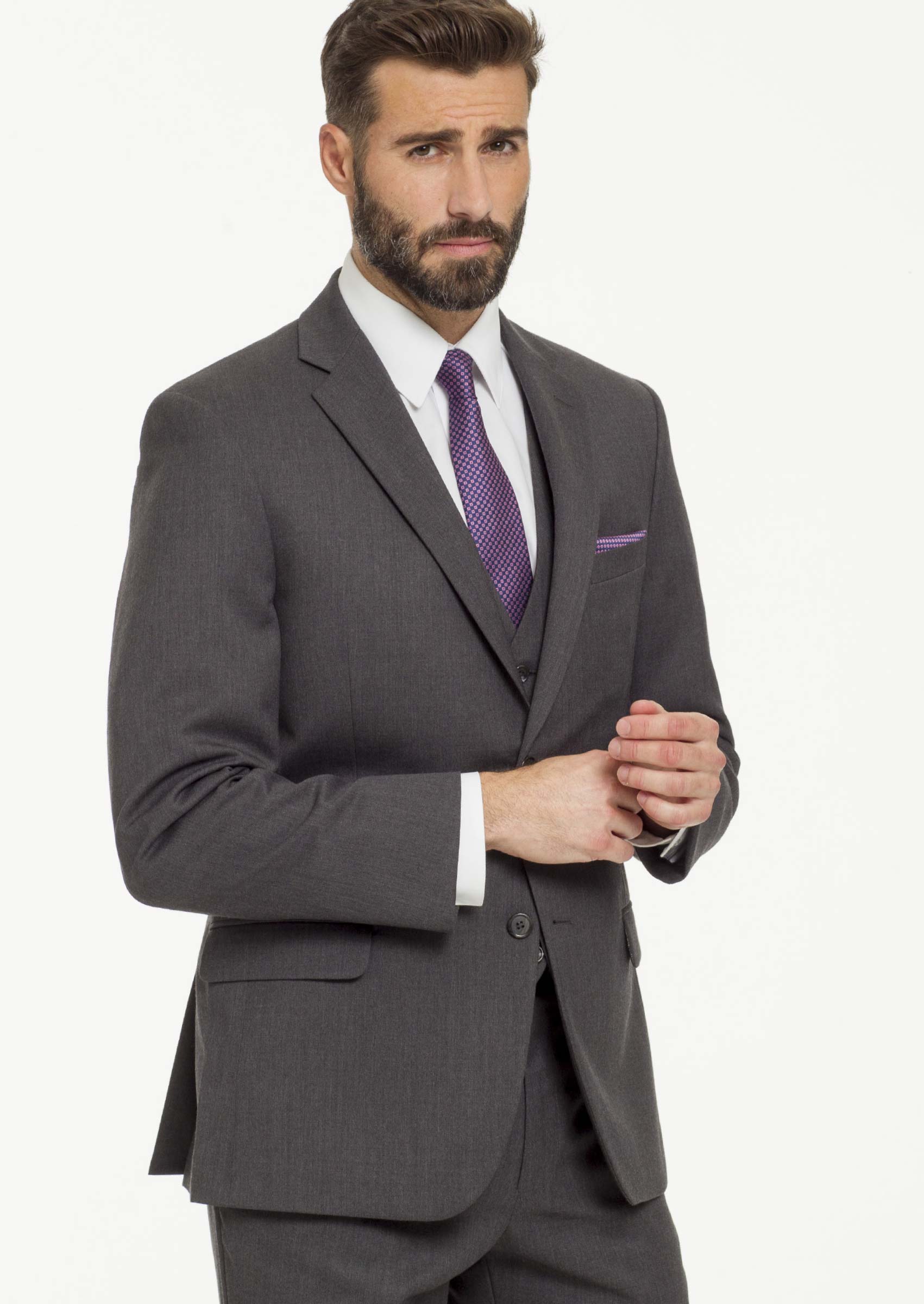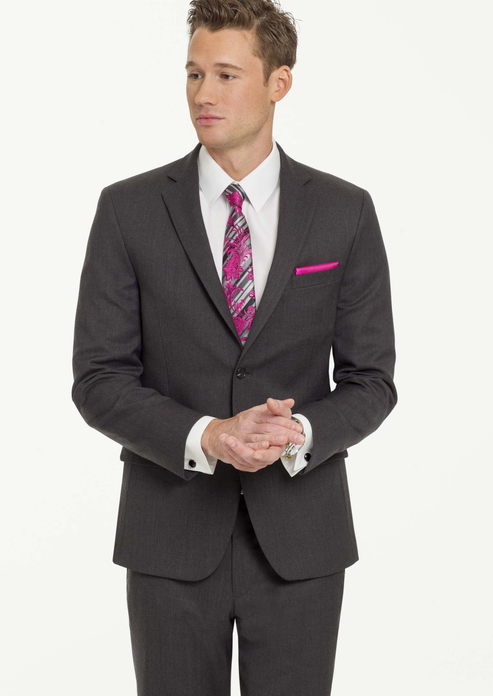 This Steel Grey suit, Holden, is made of lightweight 100% worsted wool. Its a trim fit jacket for the modern look featuring a self notch lapel and a top collar. Two bone button front with sided vents and flap pockets makes this suit a staple in men’s suit formal wear. And for a great finish, it has a fashion lining to make it stand out from your average suit.