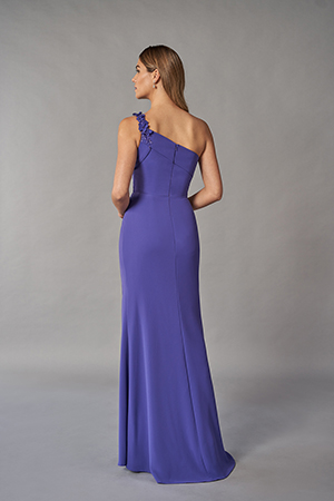 K268051 by Jade Couture is an elegant Stretch Soft Crepe Fit and Flare gown with one-shoulder look and side gathers to gently shape the waistline. The one shoulder is adorned with beaded embroidery that delicately flows into a folded asymmetrical band at the neckline. The skirt has an added slit opening for easy walking and an added sense of style.