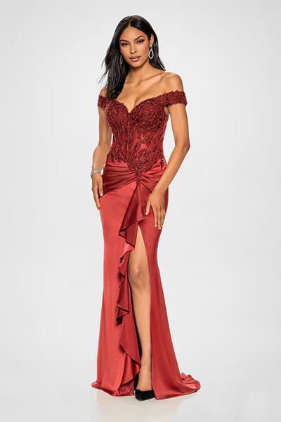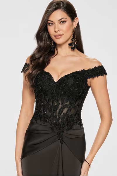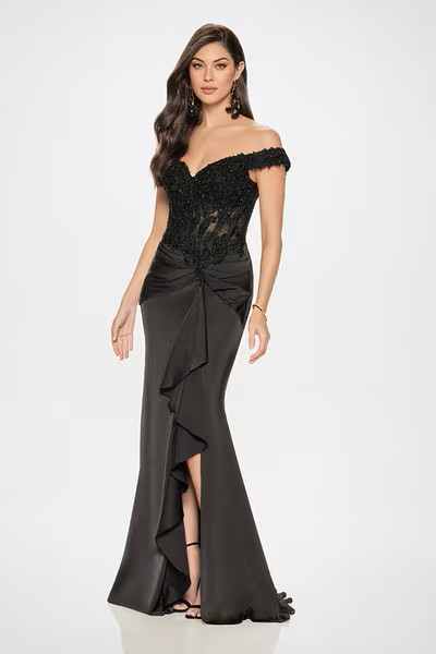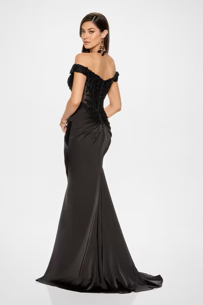 M852 by Montage – Sophisticated glamour meets sculptural design in this breathtaking evening gown, crafted for unforgettable entrances. The sleek satin fabric hugs the body in a slim-flare silhouette, perfectly balanced by a sheer illusion bodice adorned with intricate beaded lace appliqués. A romantic sweetheart neckline is complemented by delicate spaghetti straps and detachable three-quarter sleeves, offering versatile styling for any formal affair. The artful drape skirt flows into a floor-sweeping hem, featuring a thigh-high slit trimmed with a soft ruffle and finished with ruched detailing at the back for a flattering, sculpted look. Covered buttons trail elegantly down the rear, adding a timeless touch of refinement.