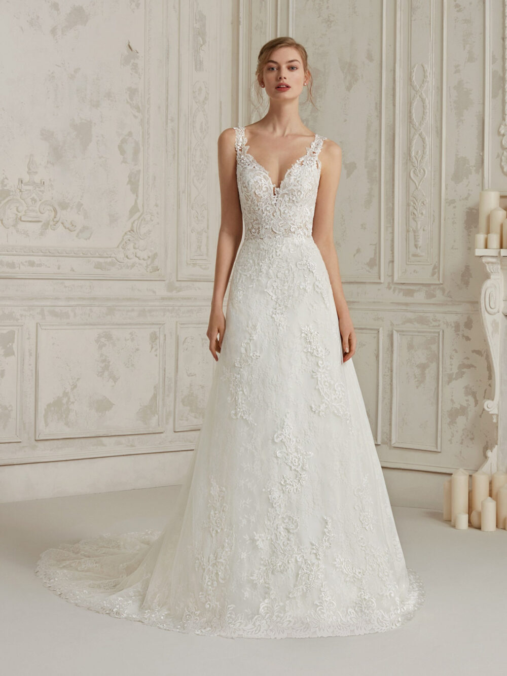 Lace and femininity join forces to give shape to this sensational princess dress. A modern and romantic proposal that plays with the fabric’s floral details and beaded sparkles to blend them with the skin in a skirt with a natural waist and in a sensual v-neck and v-back joined by straps.