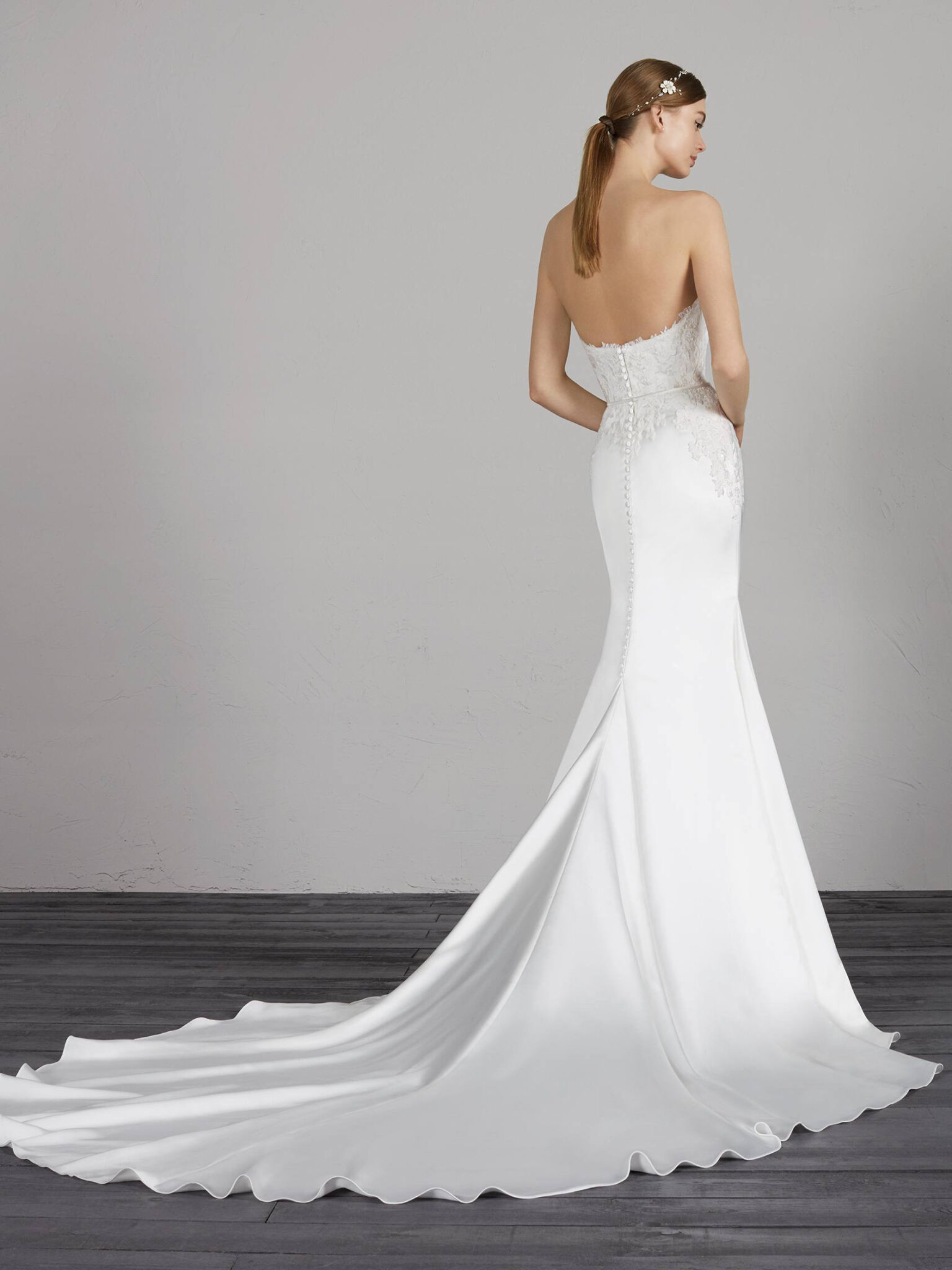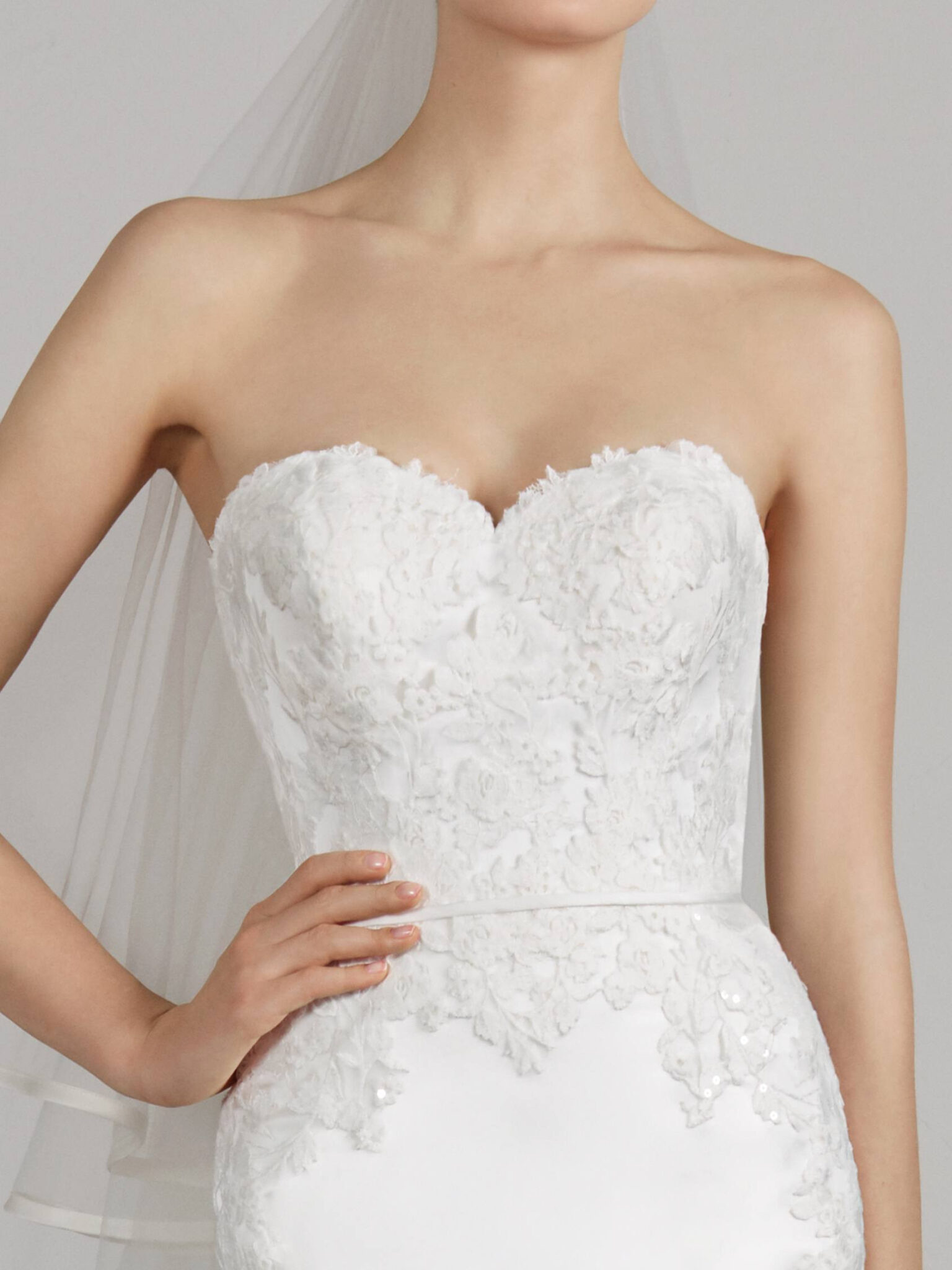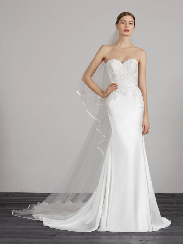 Pronovias bridal dress Marey. For the perfect statement of romance this wedding dress is a great choice. Features a sweetheart neckline, fitted bodice adorned with delicate lace appliques, and fit and flare skirt with a train.