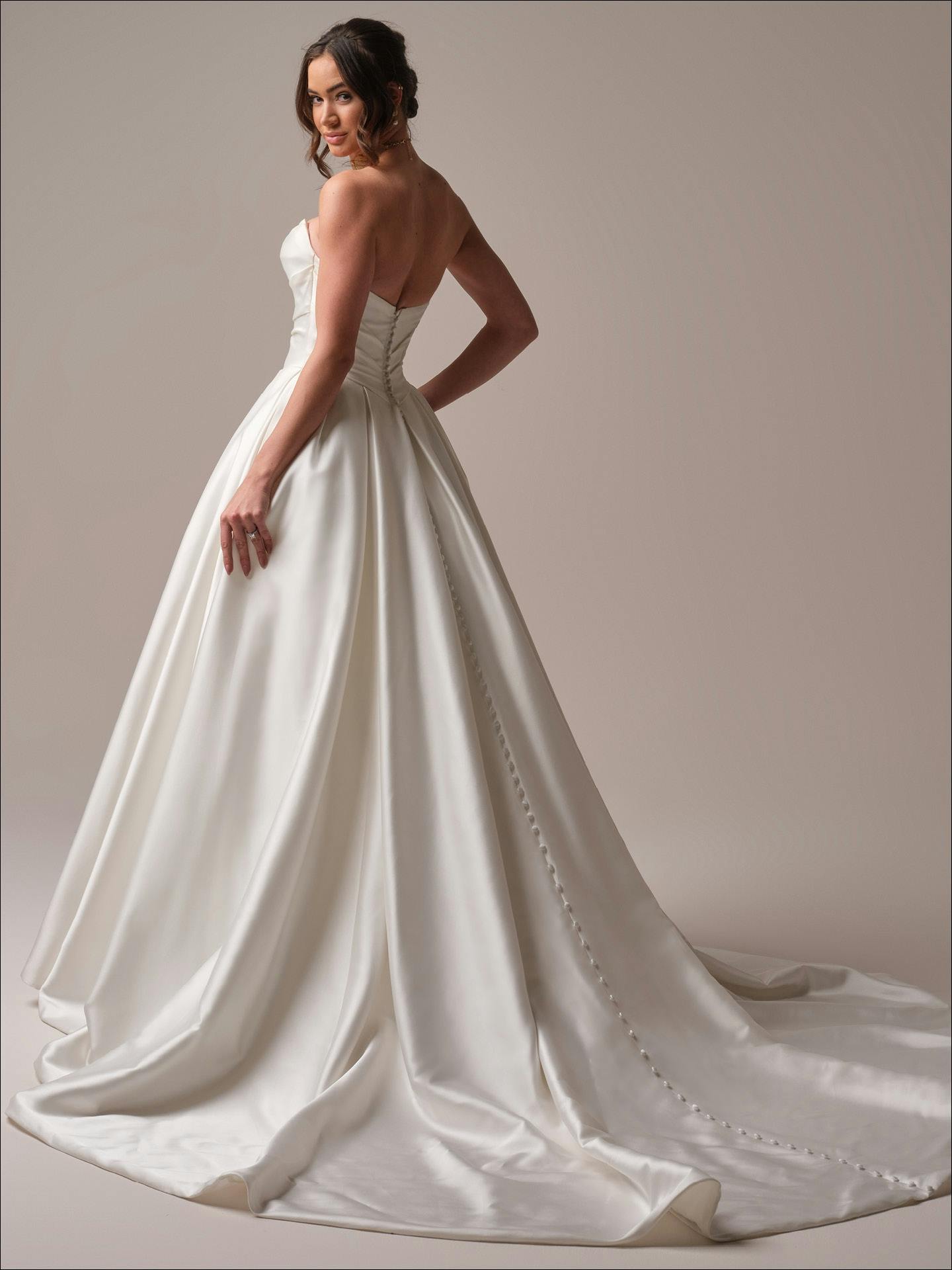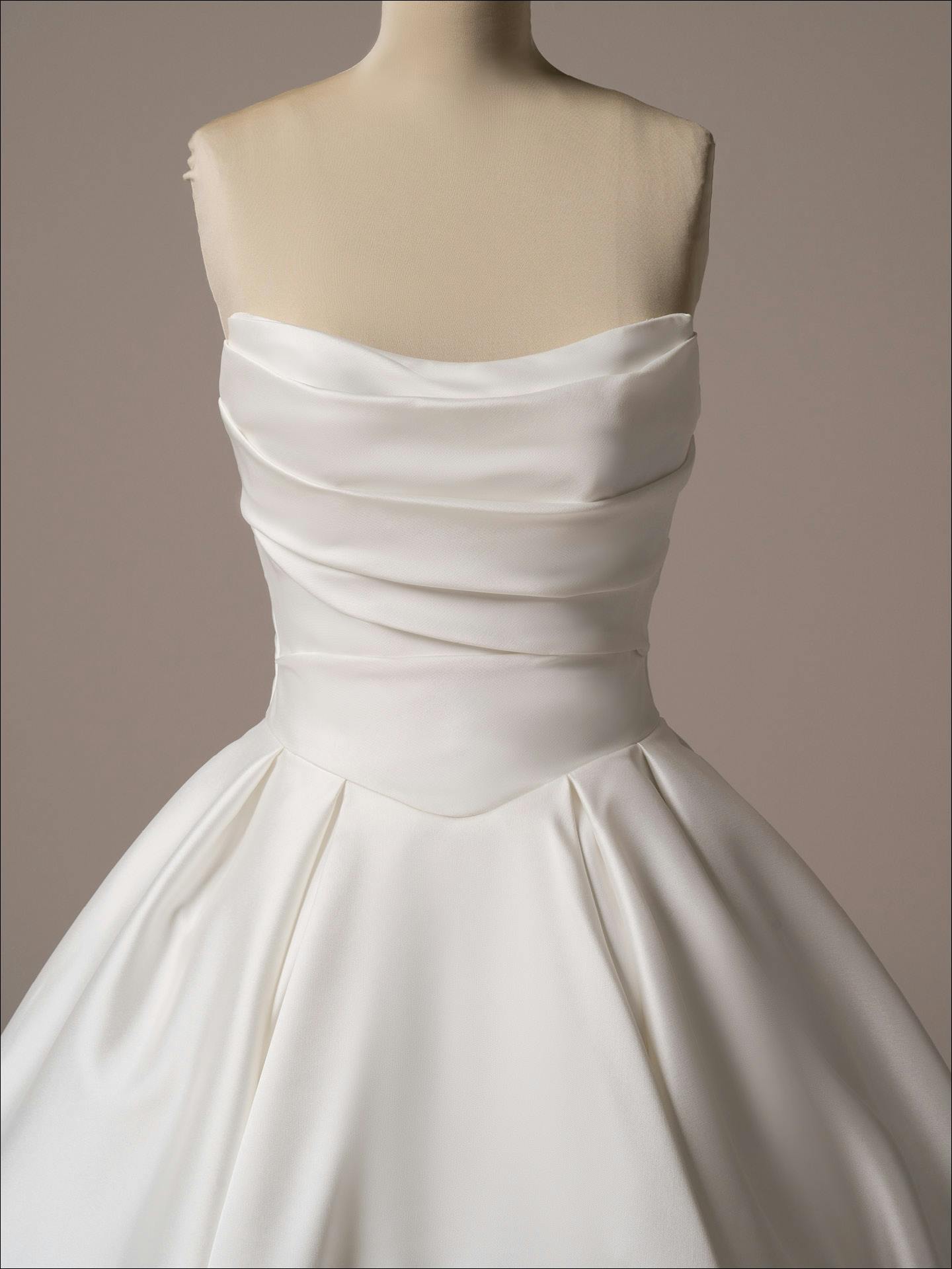 Presenting tailored satin and exquisite draping for an exceptionally couture statement. This classic satin ruched ballgown wedding gown is made to delight from every angle.