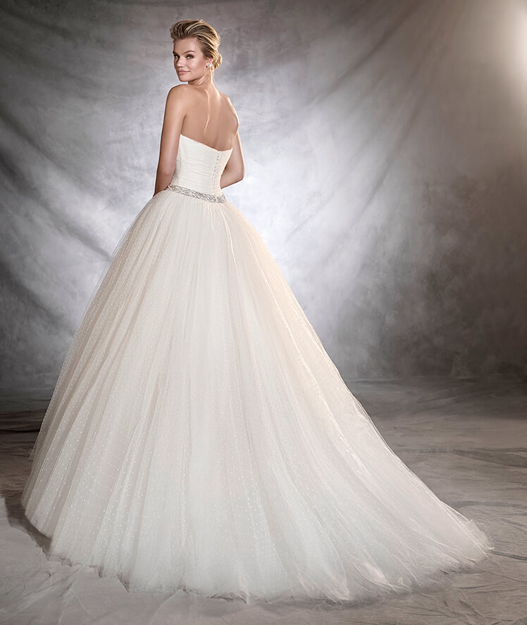 Luxurious plumeti tulle wedding dress, fitted to the waist and with a subtle sweetheart neckline. A marvelous princess dress with an imposing skirt with beautiful gemstones that cover this romantic creation.