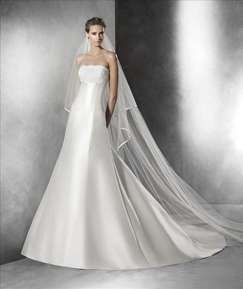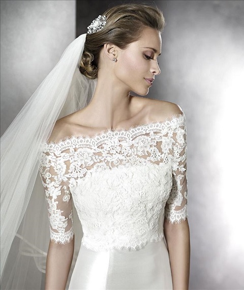 Elegant A-line Mikado satin wedding dress with removable Guipure lace jacket.