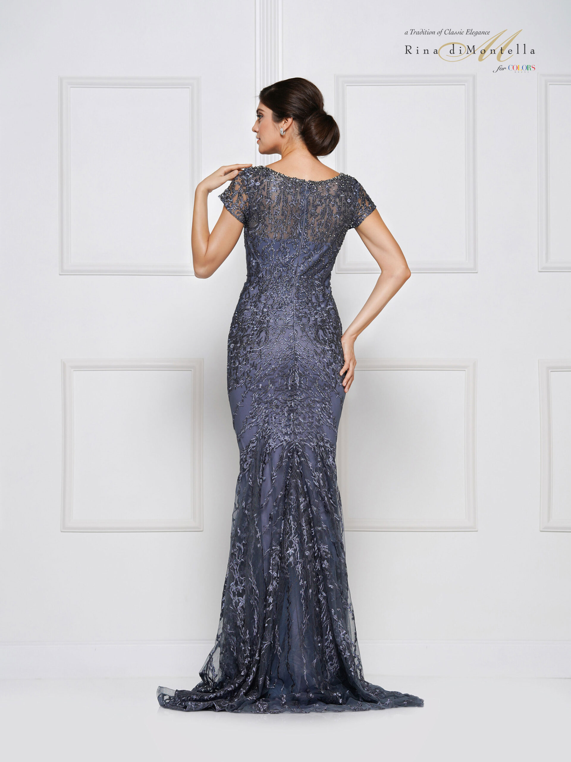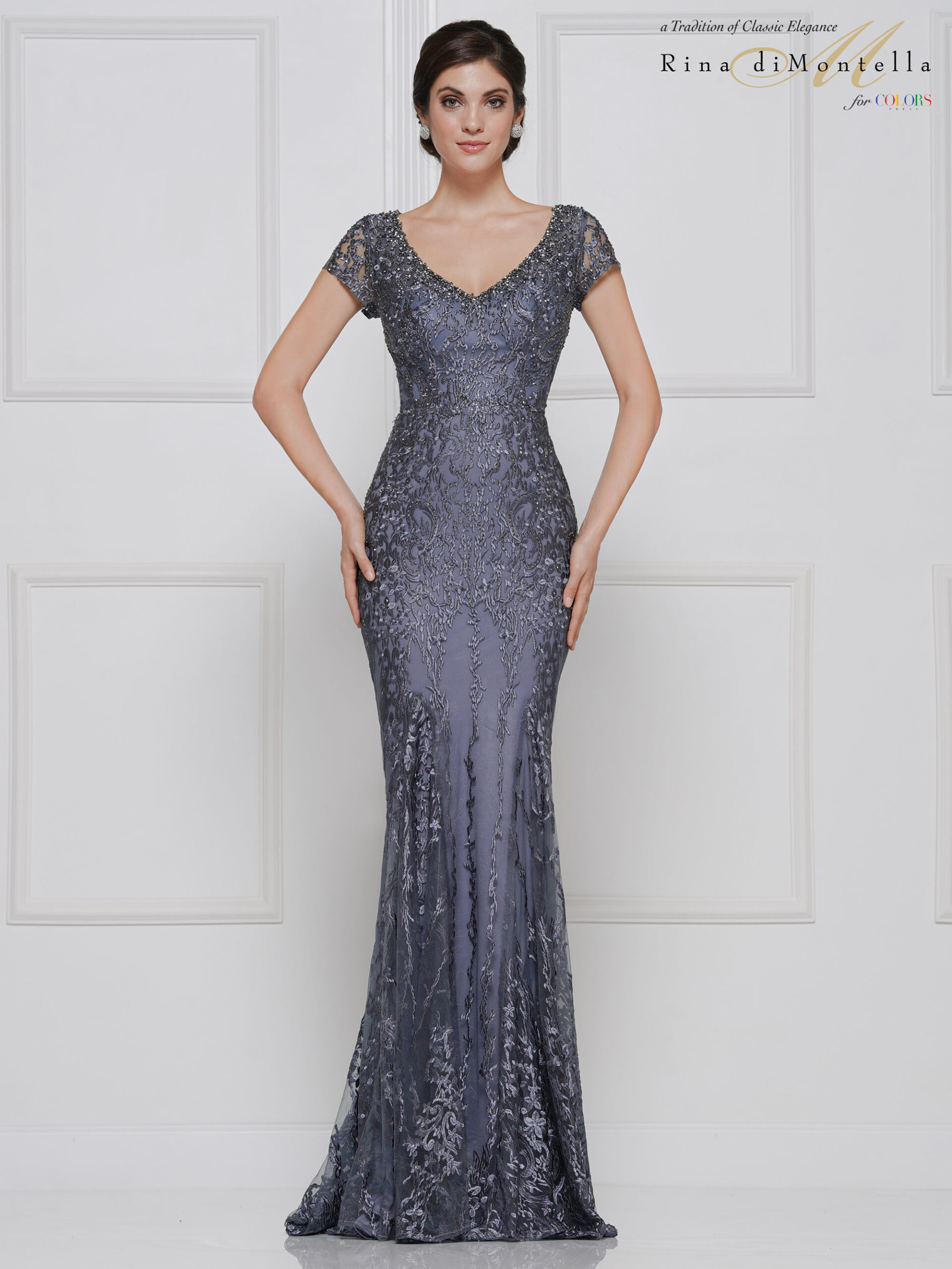 RD2657 by Rina di Montella- V-neck with short sleeves fitted bodice dress