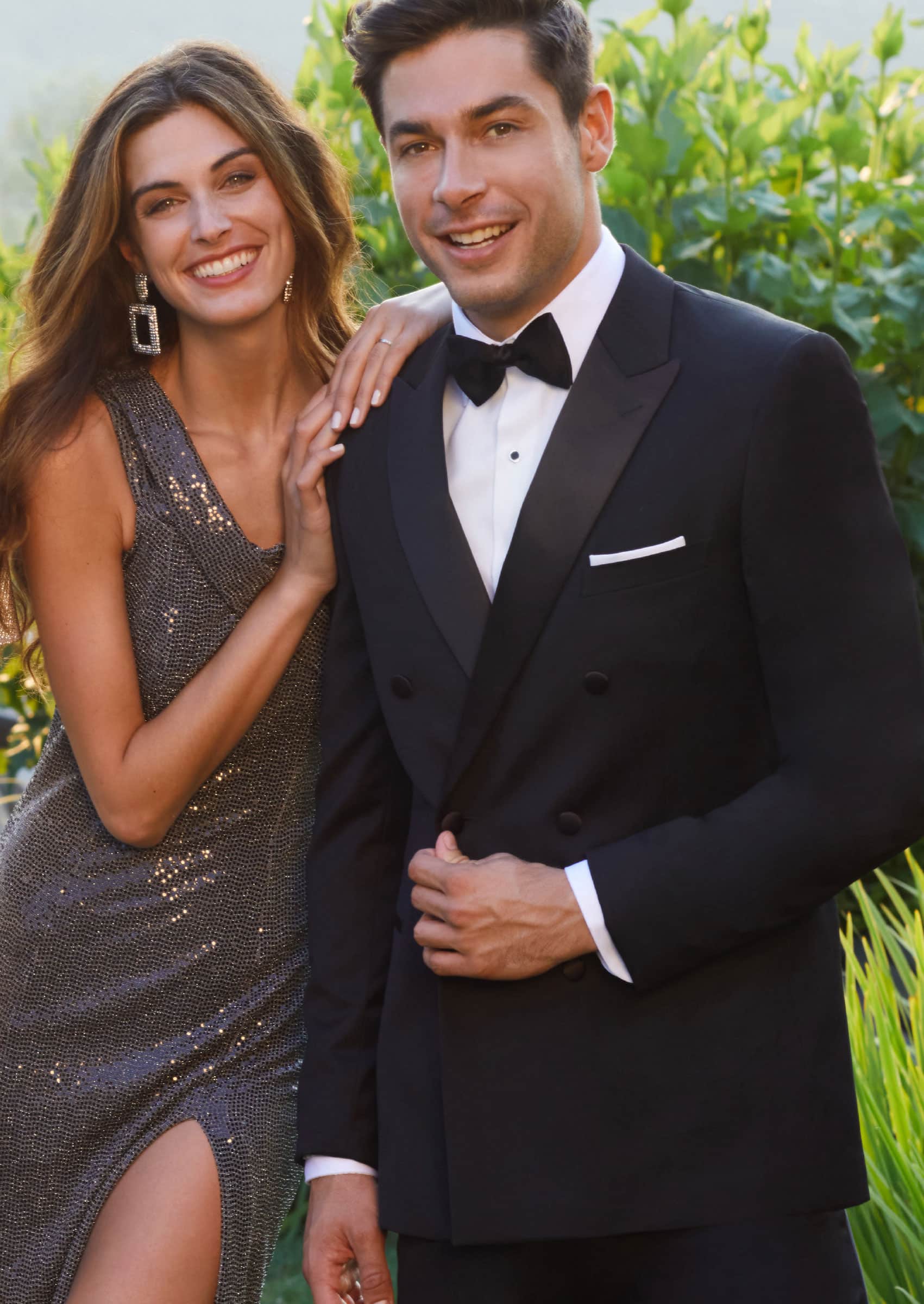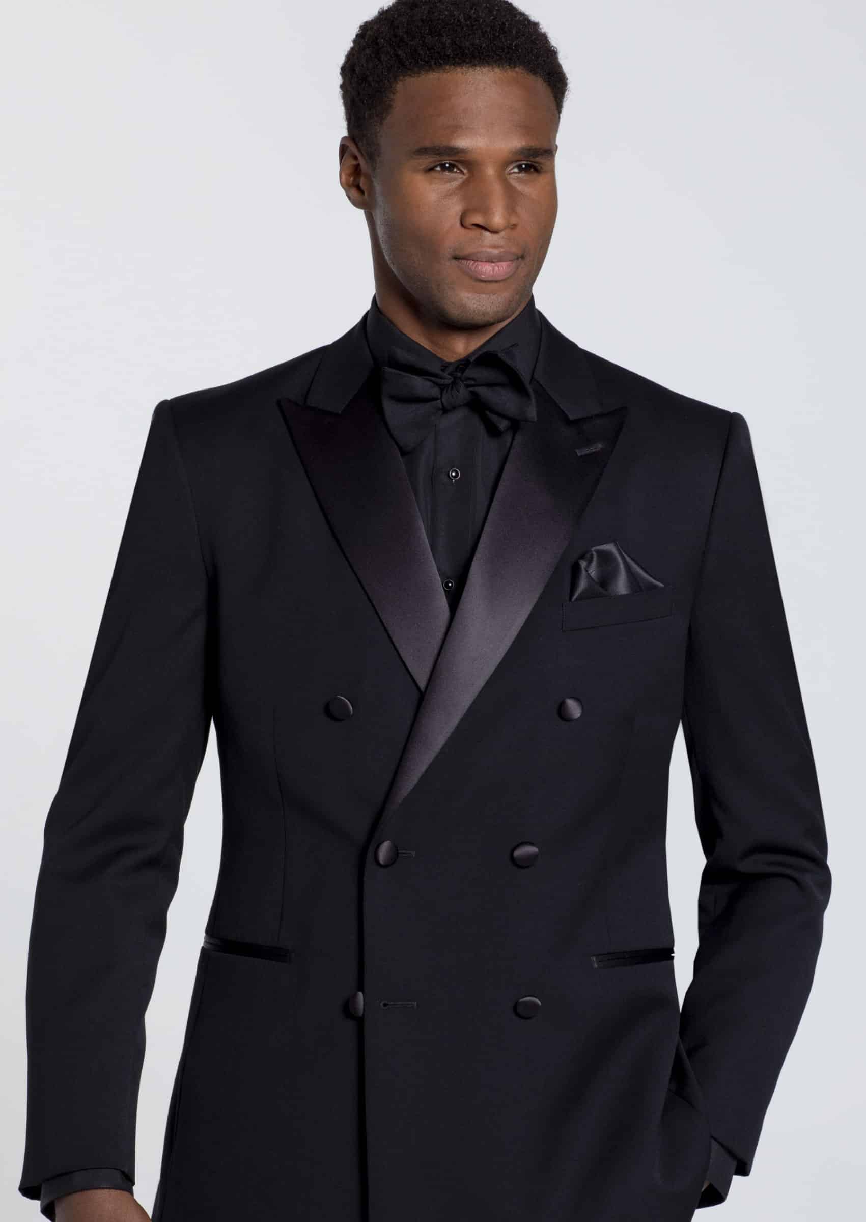 This Black tux, Romeo, is made of the ultimate luxury super 120’s fabric. Its a trim fit jacket for the modern look featuring a black satin peak lapel and a self top collar. Double breasted front with sided vents and black double besom pockets makes this tuxedo a modern twist on the classic style.