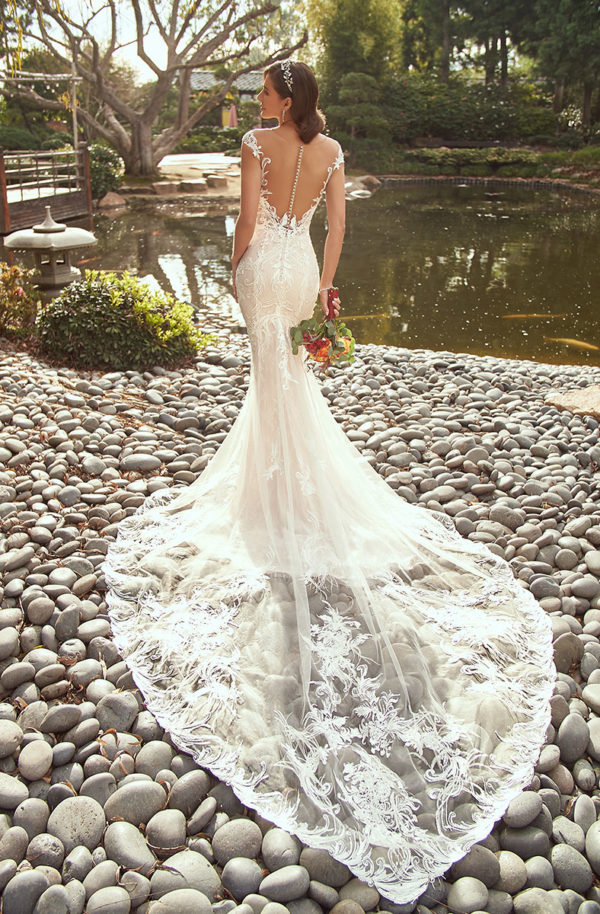 Sexy fit and flare lace gown with a sweetheart illusion neckline. A cathedral-length train with intricate lace appliques flows elegantly behind it.