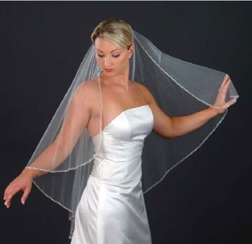 108″ x 72″ One Tier Cathedral Length, Angel Cut Veil with Crystal, Rhinestone, and Silver Bugle Beads Along a Silver Metallic Edge