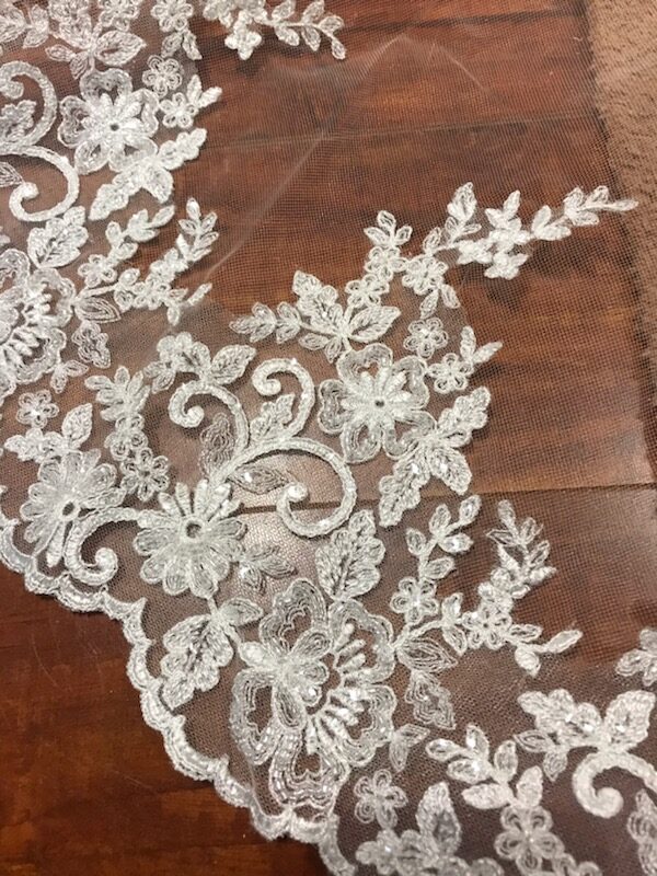 120″ x 108″ Sequin Beaded Alencon Lace with Clear Seed Beading and a Rolled edge