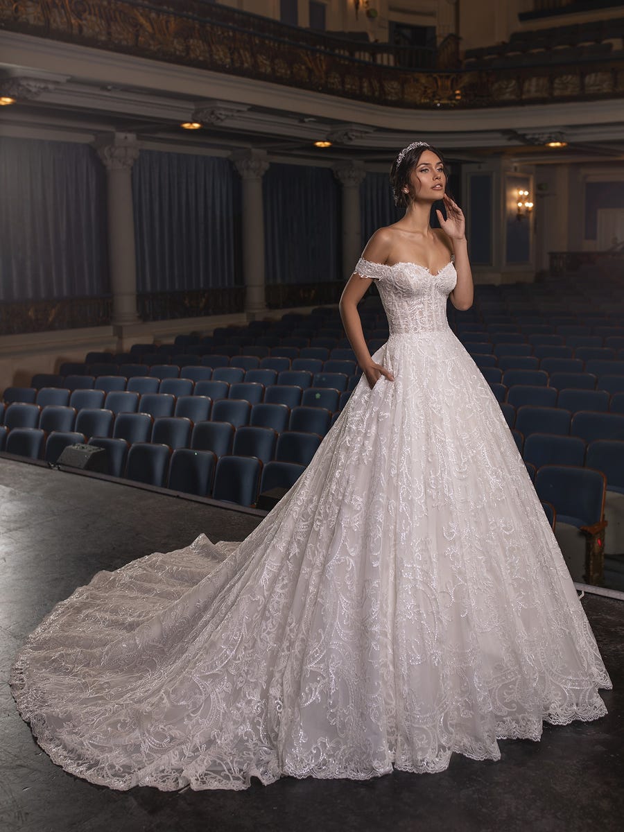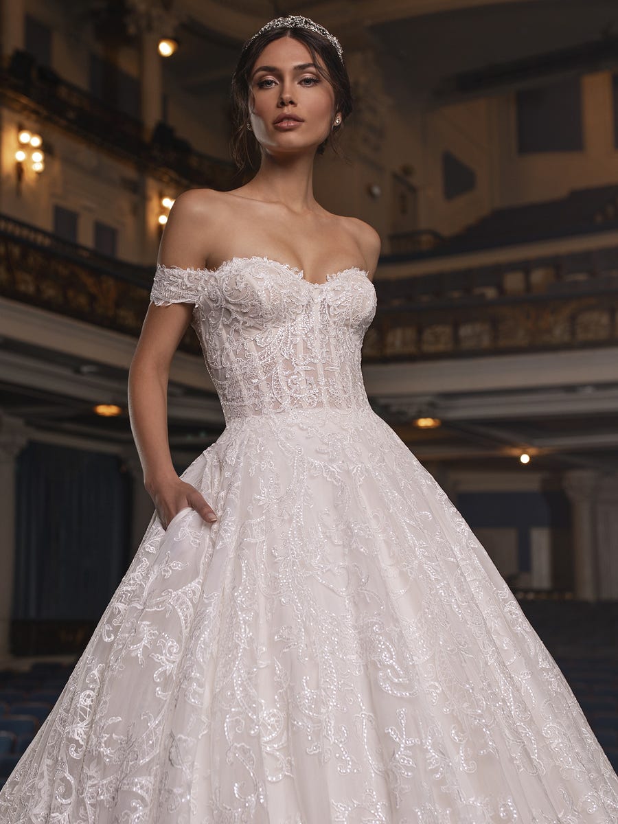Rich lace brocade scattered with subtle sequins creates a stunning wedding gown with a fitted bodice featuring flattering panels, sweetheart neckline and seductive dropped sleeves.